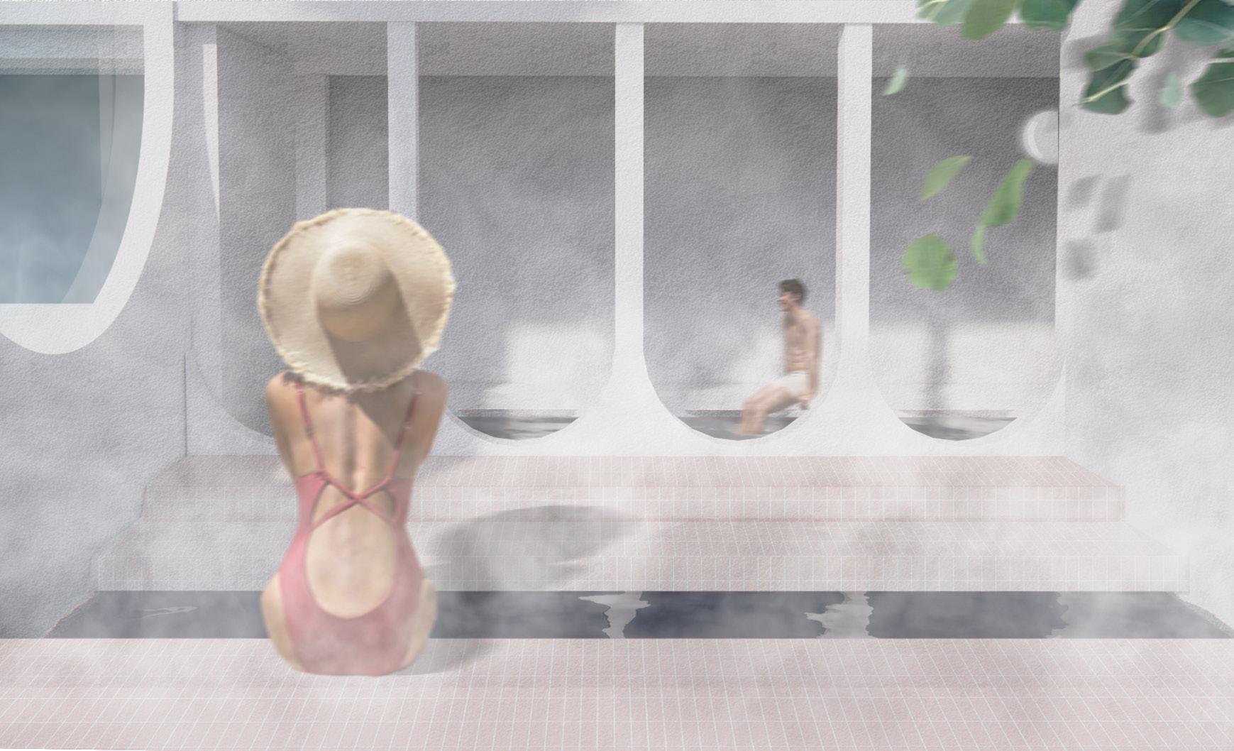 The dry zone accommodates all visitors and includes the lounge and reception areas, providing a welcoming space for relaxation and gathering. The wet zone, organised across two levels, it creates a continuous journey through water, allowing visitors to move seamlessly through a complete cycle of bathing and relaxation.