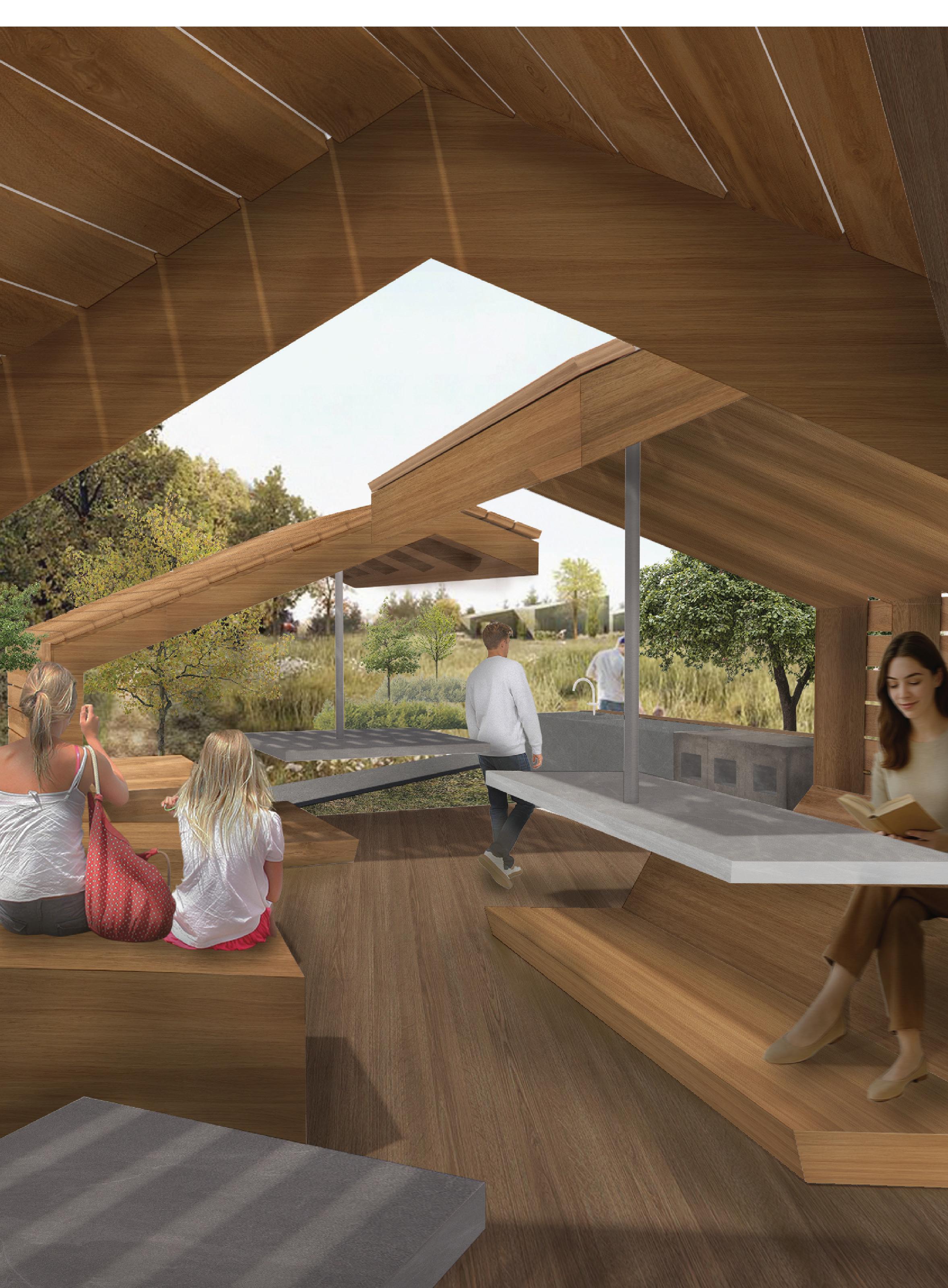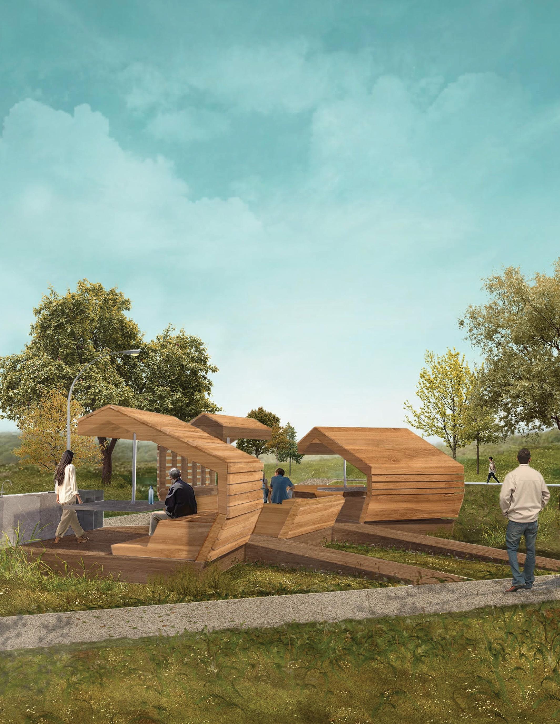 This pavilion pulls from the sense of community surrounding the park. Its arrangement of small, connected roofs reflects the rhythm of a neighborhood, where each “house” provides shelter yet remains part of a larger whole. The structure is built from a system of wooden beams joined by steel flitch plates, giving stability to the cantilevered roof modules while keeping a light, open expression. Each unit is backed with wooden panels for enclosure and finished with a protective sealant for durability. Slits between the wooden planks allow sunlight to filter through. Placed at the park’s center between the market, playground, and rink, it becomes a natural gathering point.