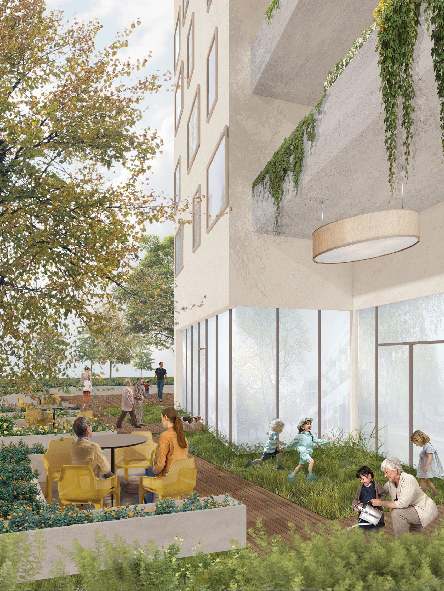 This project reinterprets the idea of community through a modular, interlocking massing that forms a vertical neighborhood. The staggered volumes create natural corners that open toward key views and allow for cross ventilation, light, and shared terraces. Larger family units occupy these corners to maximize exposure and livability. At the ground level, the building connects to its surroundings through active public spaces as a café, workspace, and daycare that spill toward the street and garden setback. These shared programs anchor the building in its context, transforming the edge of the sidewalk into a communal threshold.
