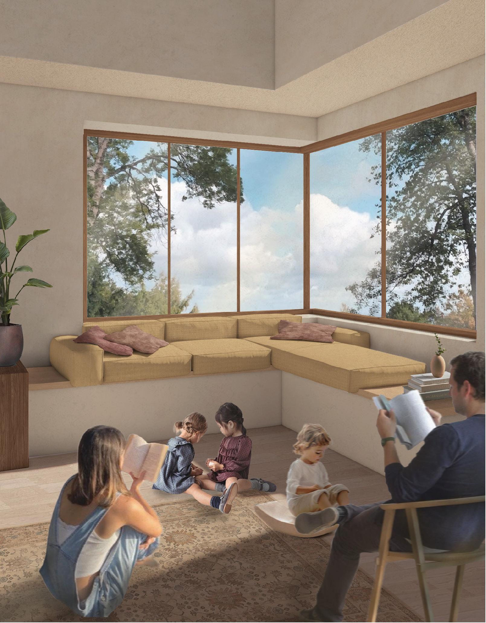 The double-height entrance opens to a central reading area, seating zones are strategically placed along the sunlit area to reinforce the relationship between reading and natural light, while the solid zones hold more enclosed functions. BOOKS
