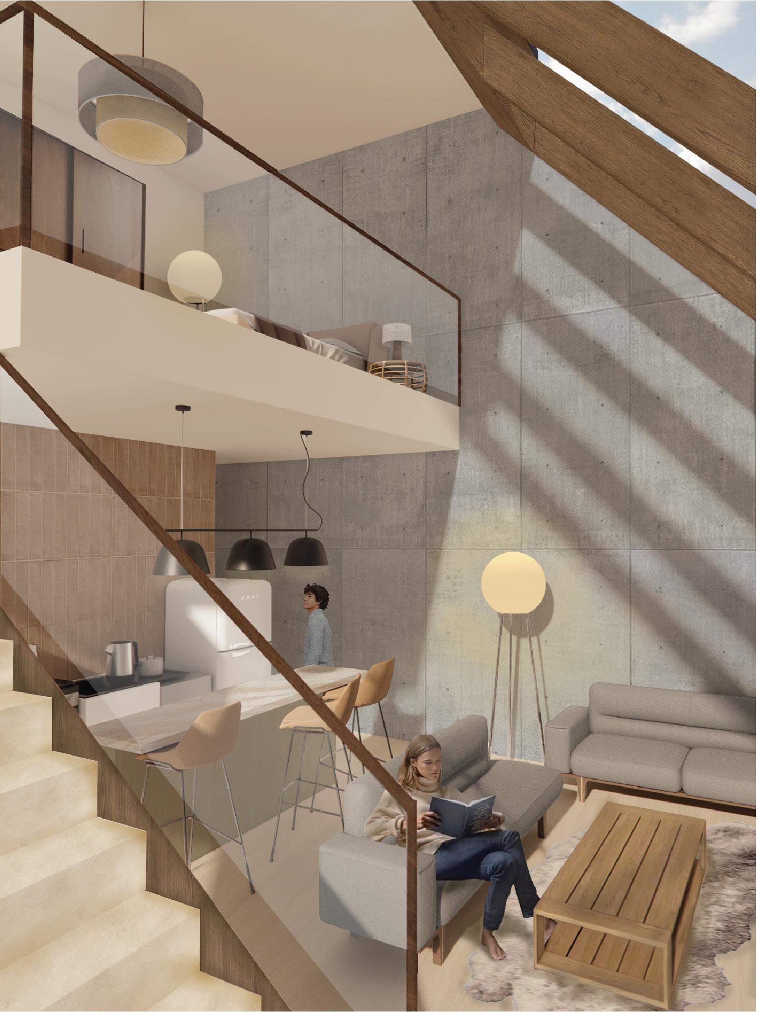 Balconies are terraced rather than stacked to preserve open-to-above conditions and maximize daylight along the east–west solar axis. These terraces rise to a fully open rooftop that functions as a communal outdoor room