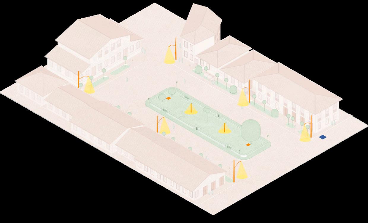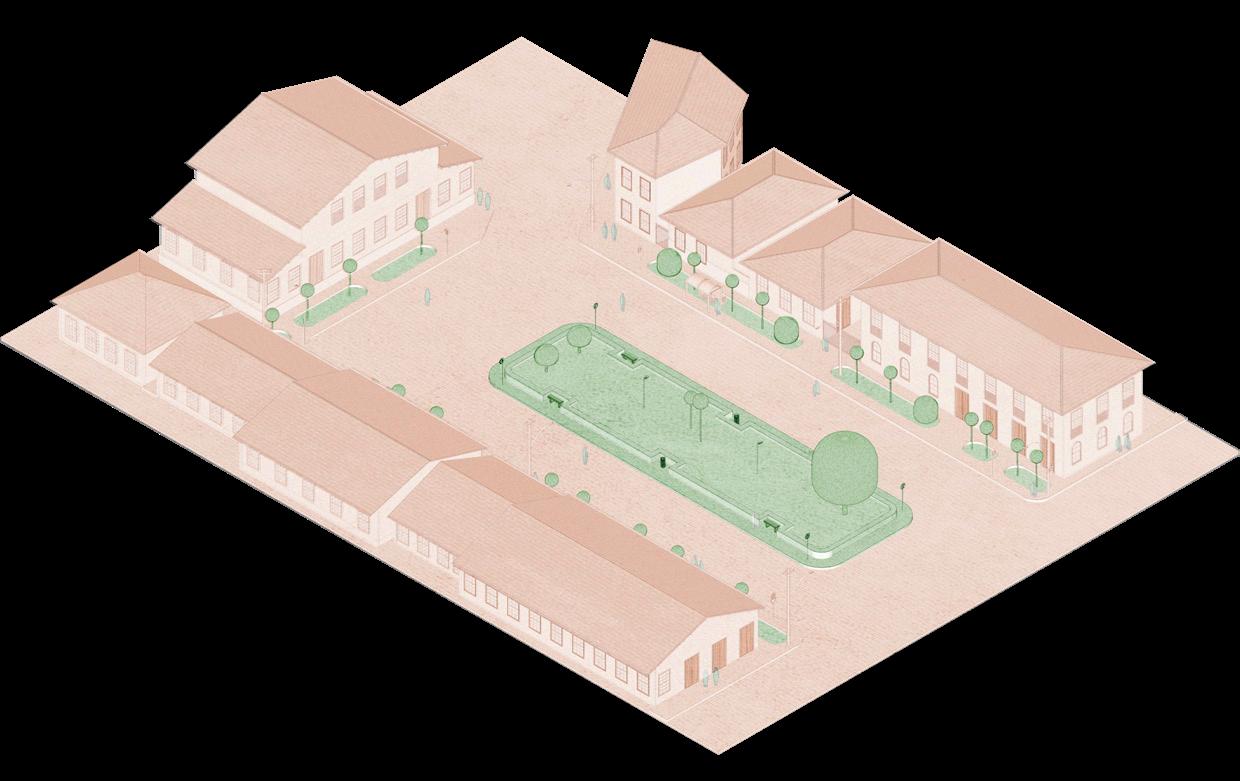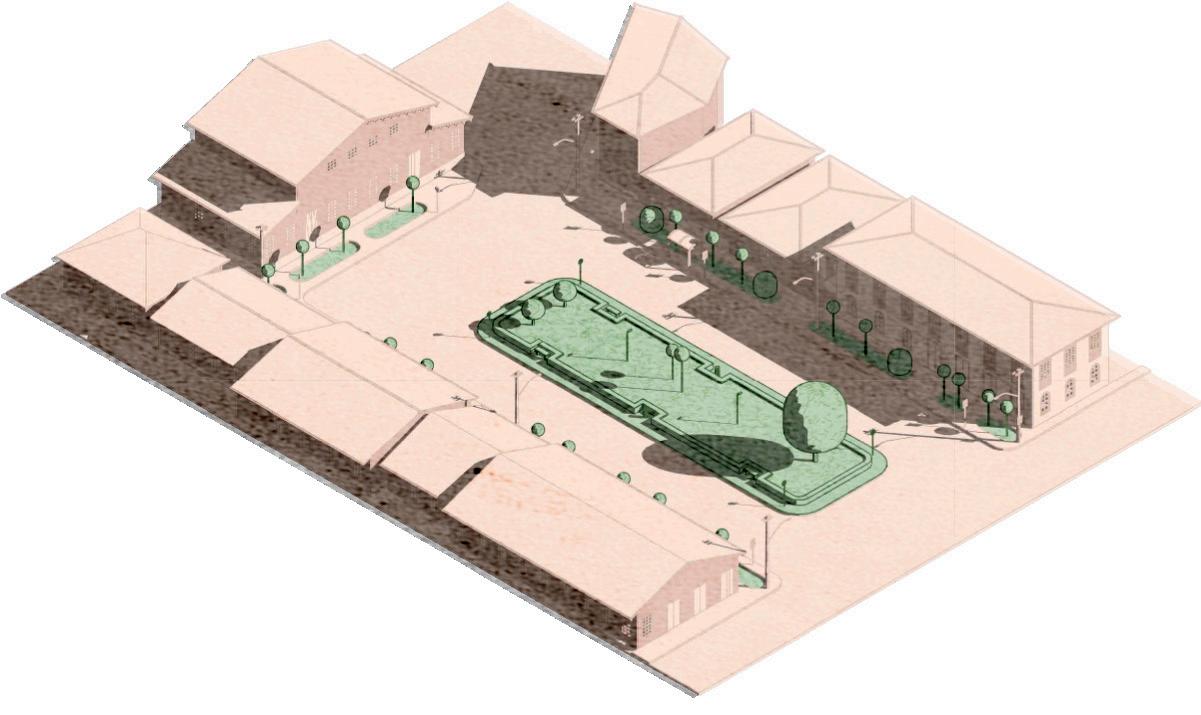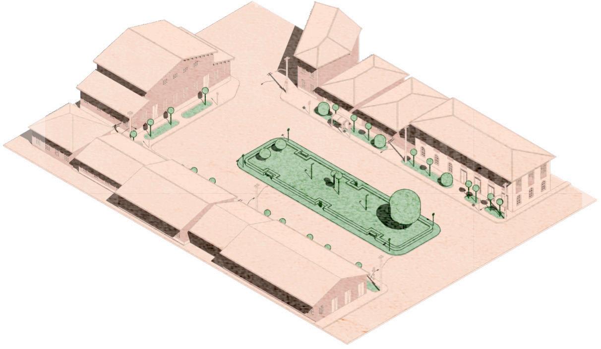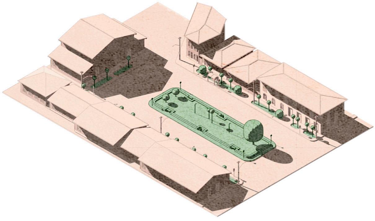 2. Melhorias do espaço em prol do incentivo a permanência no espaço público: estudaremos a instalação de pontos elétricos, além de mobiliário urbano como mesas e bancos de pedra no centro da praça. Também planejamos manter a mureta que contorna a praça, utilizada como assento secundário, mas com a proposta de abrir algumas passagens para a construção de escadas e substituir os bancos existentes por uma arquibancada que se integre à mureta.