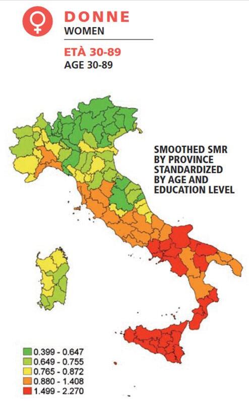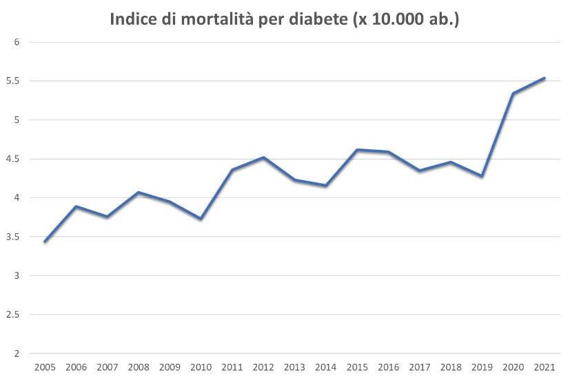 D’altro canto, l’elevato tasso di mortalità per diabete e il rapporto fra basso livello di scolarità e rischio di morte per diabete suggeriscono la presenza di possibili criticità ed enfatizzano il ruolo del basso stato socio-economico come indicatore di fragilità e vulnerabilità.