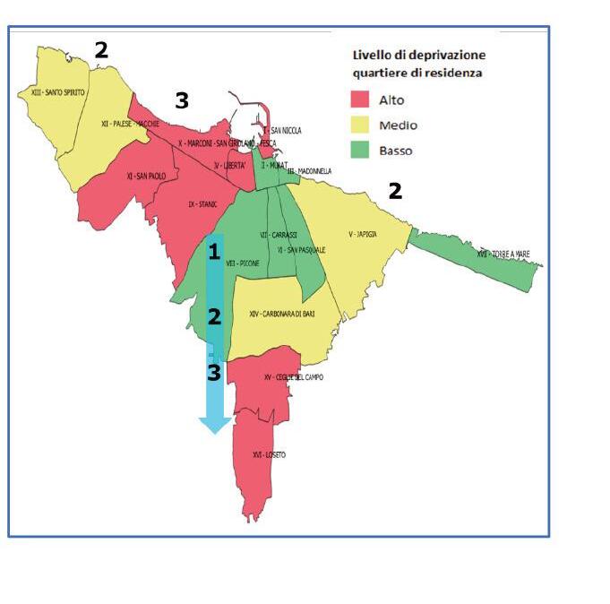 La Tabella 1 mostra la distribuzione della popolazione, residente nel Comune di Bari, per quartiere di residenza e la classificazione dei quartieri per livello di deprivazione. In accordo alla classificazione effettuata, il 40.92% della popolazione vive in quartieri a basso livello di deprivazione, il 26.48% in quartieri mediamente deprivati e il 32.60% dei residenti vive in quartieri altamente deprivati. I quartieri con un basso livello di deprivazione sono collocati nel centro della città (ad eccezione del quartiere periferico Torre a Mare considerato un quartiere residenziale) mentre i quartieri con un medio ed alto livello di deprivazione sono disposti a “macchia di leopardo” sul territorio del comune di Bari (Tabella 1 e Figura 1).