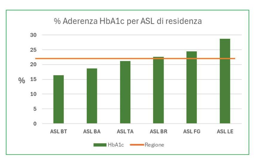 Tabella 2 e Figura 5. Percentuale di aderenza alle prime 4 Raccomandazioni per ASL di residenza PDTA DIABETE in Puglia - anno di valutazione 2022