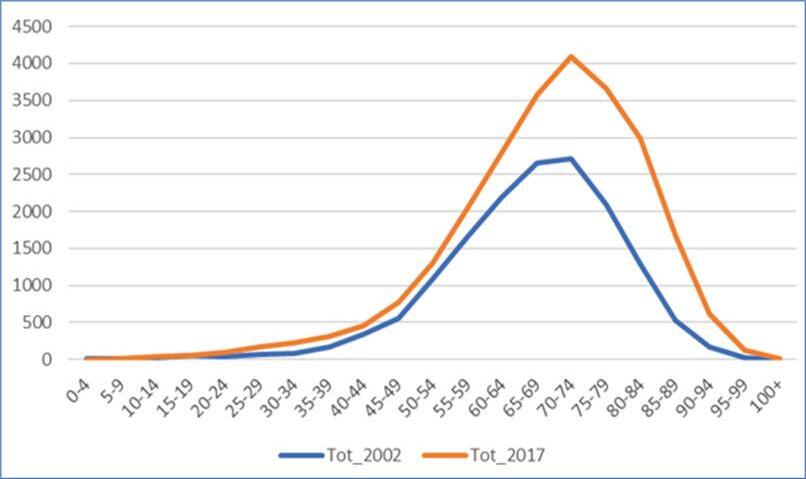 La Figura 4 mostra come, confrontando il 2002 e il 2017 per quanto riguarda la composizione della popolazione residente nel comune di Bari affetta da diabete, si sia verificata una crescita sostanziale della popolazione anziana (V. Lepore, comunicazione personale. 12° Italian Diabetes Forum, 2019).
