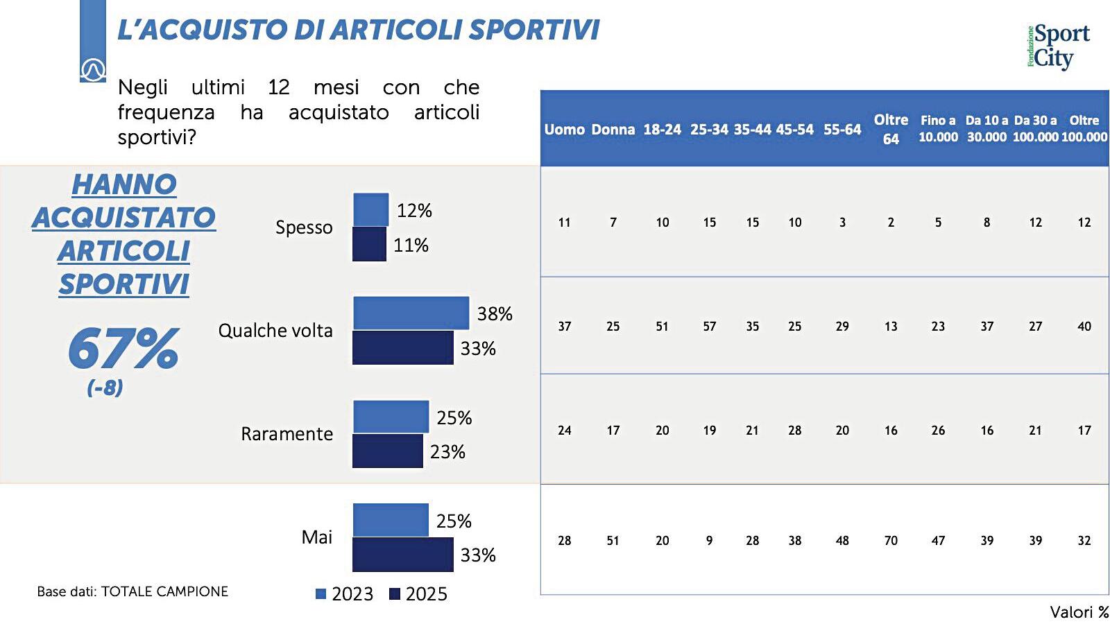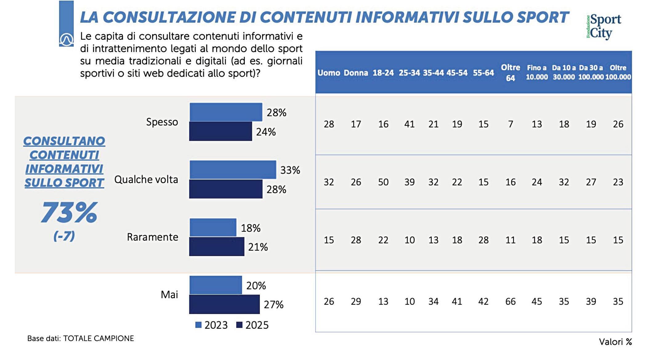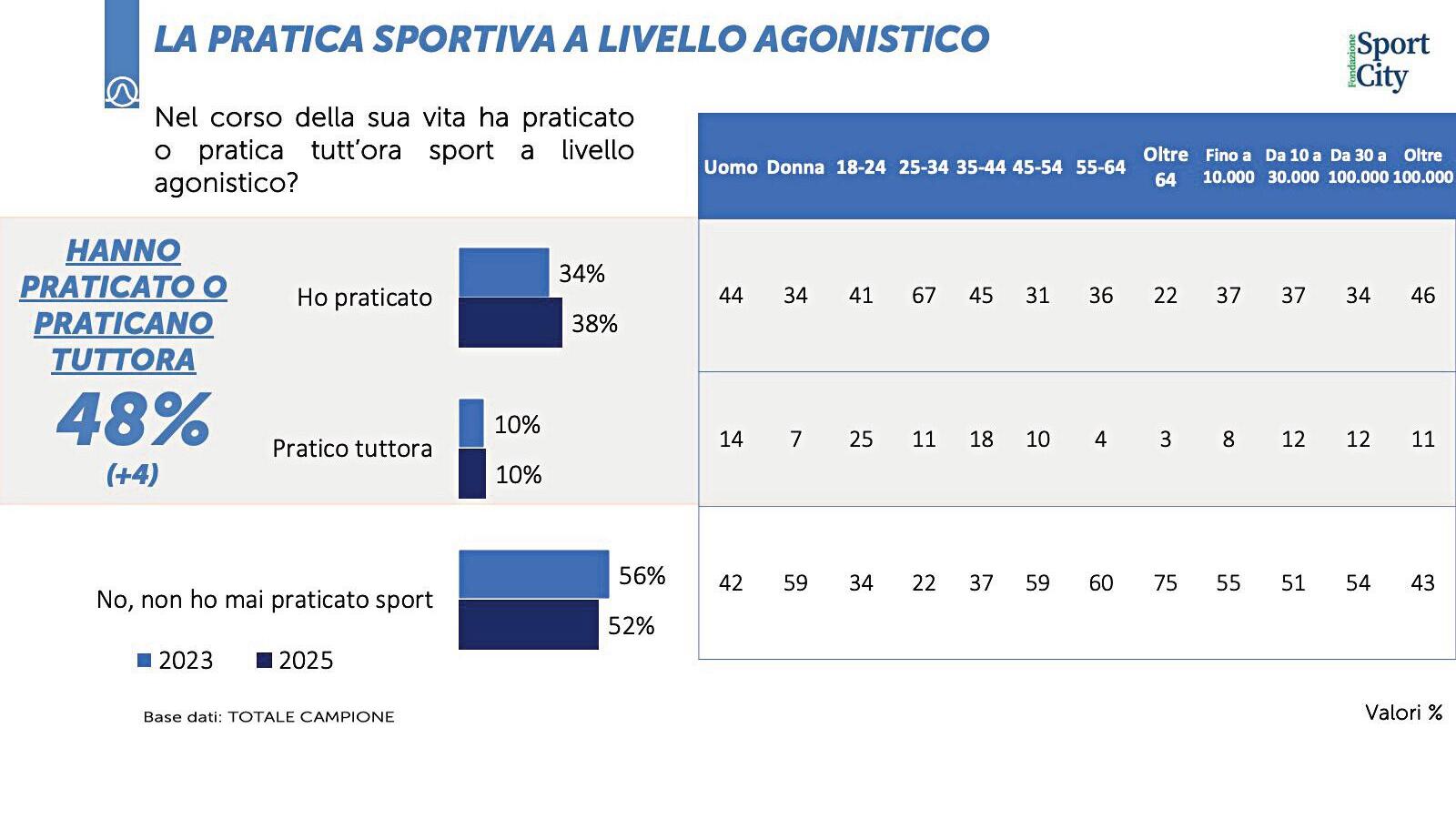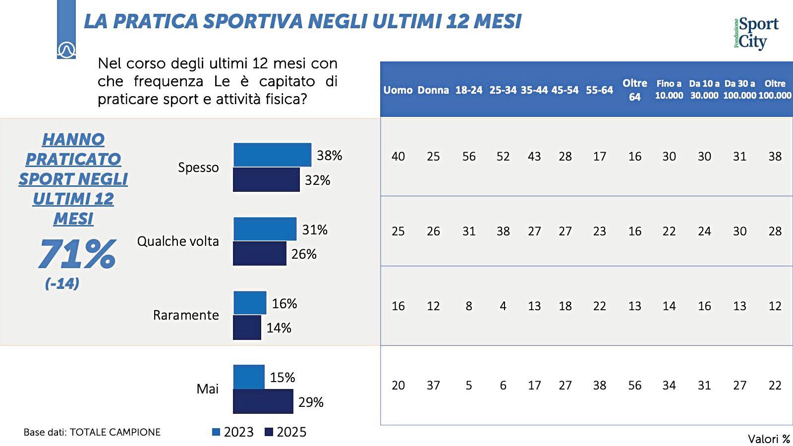 • La pratica sportiva continuativa è aumentata al 25,5%, superando i livelli pre-pandemici del 2019 (23,4%).