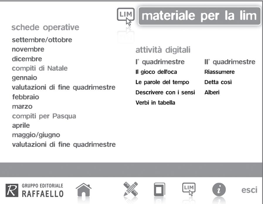 – attività digitali divise tra I e II quadrimestre. Si tratta di attività che possono essere condotte con l’aiuto di risorse presenti nel CD-Rom allegato, pensate in stretto collegamento con le attività del primo e del secondo quadrimestre, utilizzabili con la LIM o con un videoproiettore.