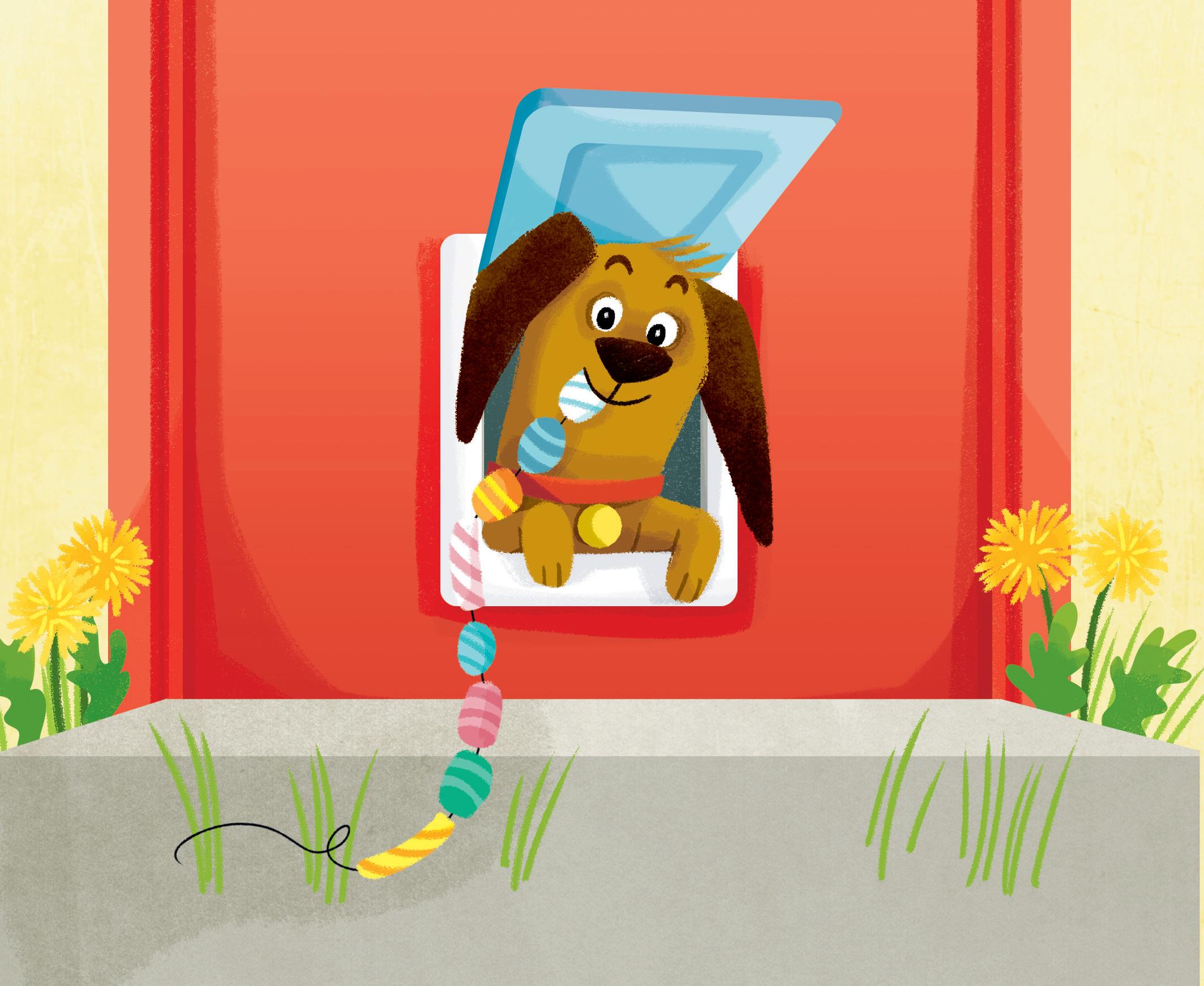 – Tanto per cambiare... tu non hai fame... sei annoiato e senti la mancanza della tua famiglia! Perché non esci a correre nel prato? Basta che passi dallo sportellino di quella porta rossa!