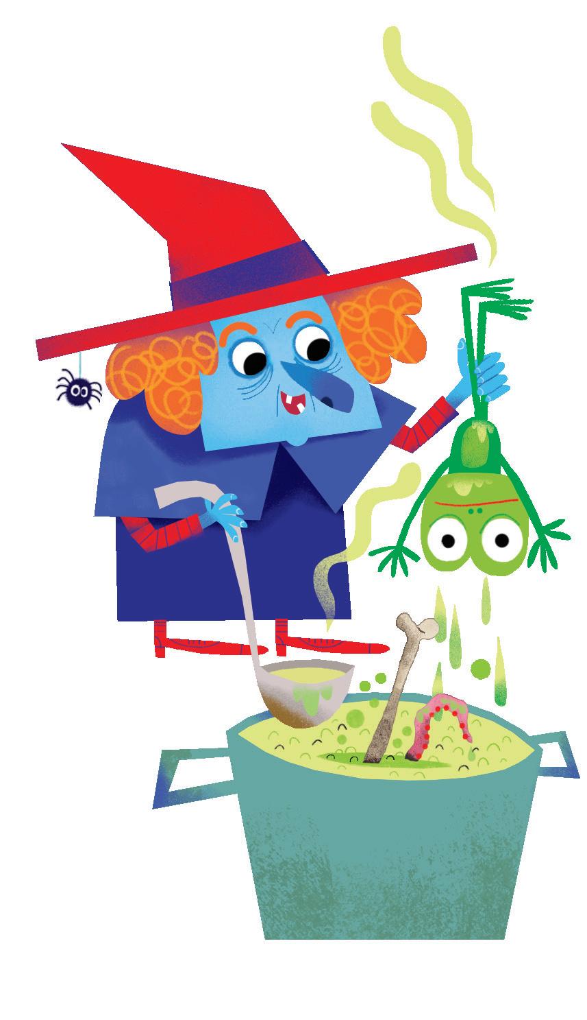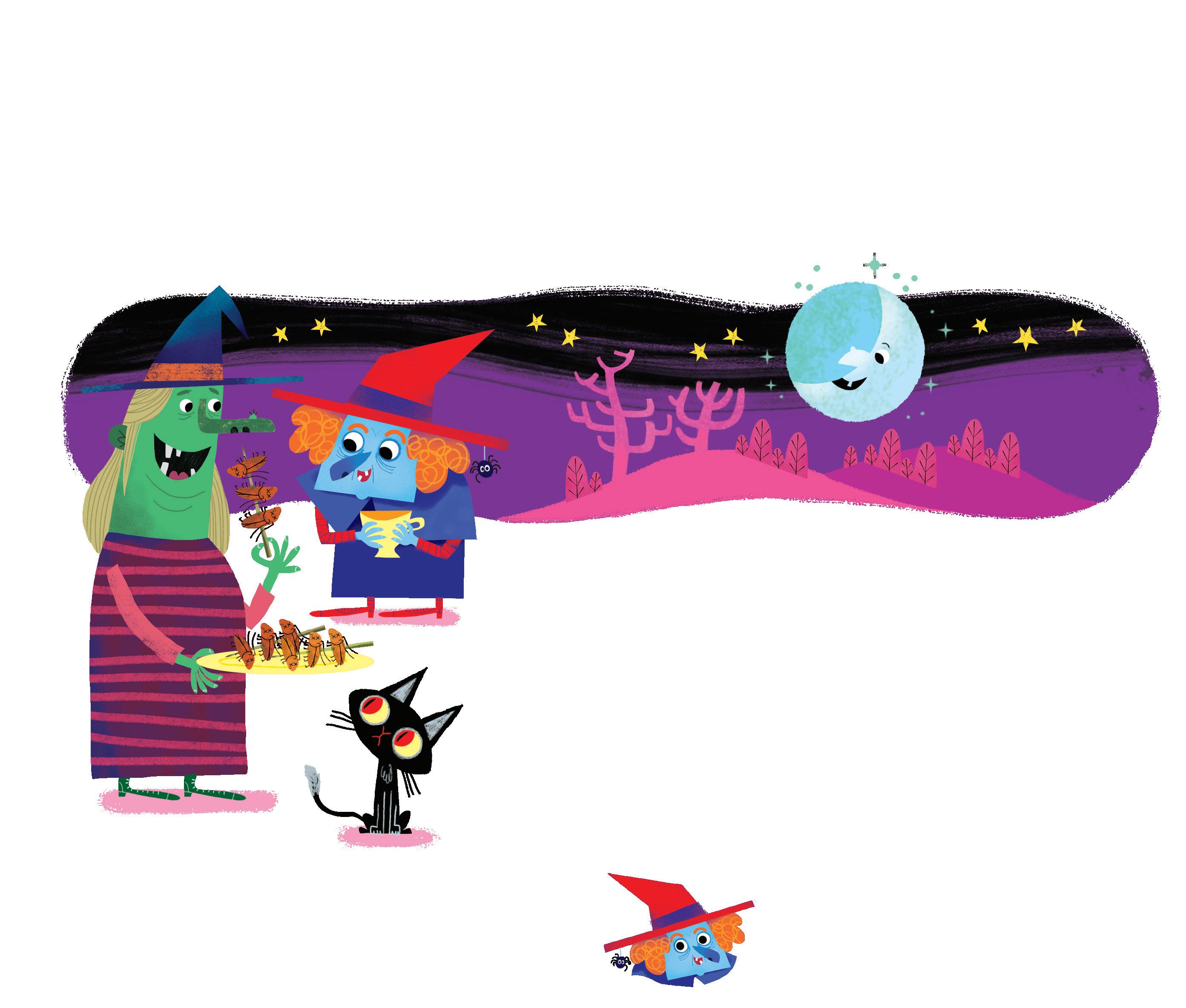 La strega Puzzy atterro e lascio la scopa a chiacchierare con le altre nel parcheggio. Poi attraverso il boschetto e raggiunse la strega Viperilla che arrosti degli scarafaggi sulle braci di un falo. Li vicino, altre due streghe preparavano le tartine. Ce n’erano di tre tipi: alla saliva di ragno, al pate di rana e alle mosche sottaceto. Le streghe bevevano te di palude. Lassu nel cielo la Luna splendeva.