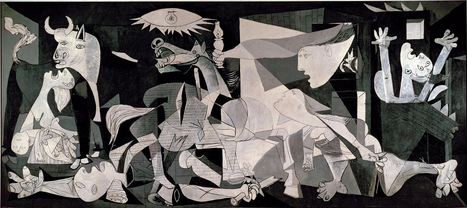 I’m Pablo Picasso, a Spanish painter. I experimented many styles and art forms during my life and approached different art movements. Historians normally divide my production of more than 22,000 works into two main periods - the “blue” one and the “rose” one, according to the use I made of colour. I developed Cubism and this is one of the most famous Cubist paintings, Guernica. It is a mural-size oil on canvas depicting the bombing of Guernica, Spain, by German and Italian warplanes on April 26 th 1937, during the Spanish Civil War. Guernica is a small village in Spain’s Basque region and it was considered the core of the Republican Resistance movement in the north. I was commissioned by the Spanish Republican government to paint a mural for the Paris International Exposition in 1937. This was the result - a black, white and grey mural. The colours I used express pain, chaos and the lifelessness of war; the posture of the bodies expresses protest; the flaming buildings and walls stand for the destructive power of war; the broken sword represents the defeat of the people during the attack on Guernica. Guernica is certainly a reminder of the tragedies of war, and has become an anti-war symbol.
