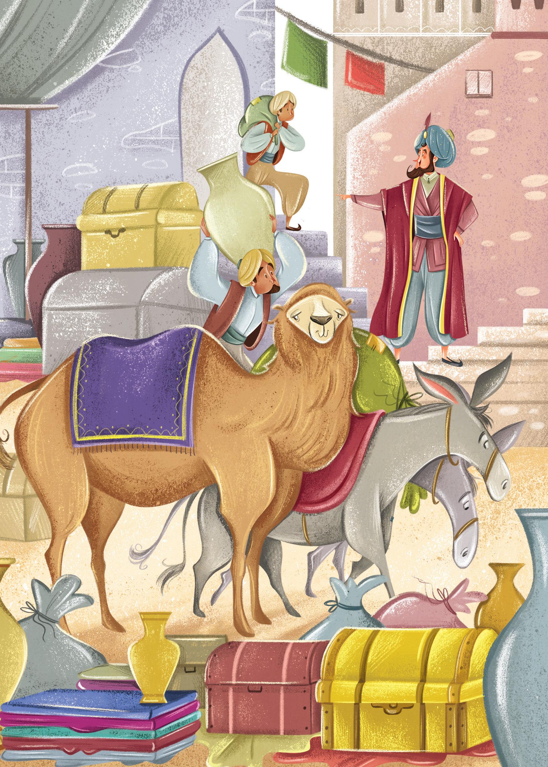 La stessa storia si ripeté per molti giorni tanto che il mercante, all’ora del tramonto, quando gli animali venivano ricondotti nelle stalle dopo il lavoro nei campi, aveva preso l’abitudine di sedere accanto alla mangiatoia per il divertimento di ascoltare i discorsi fra le due bestie.