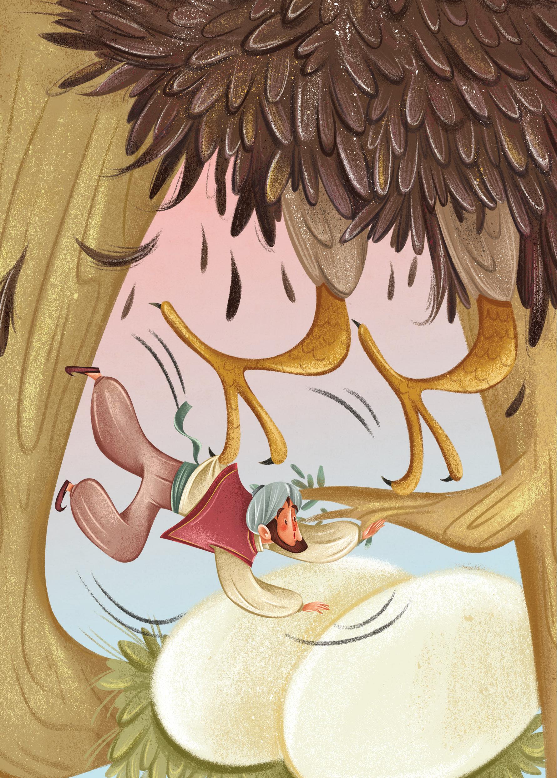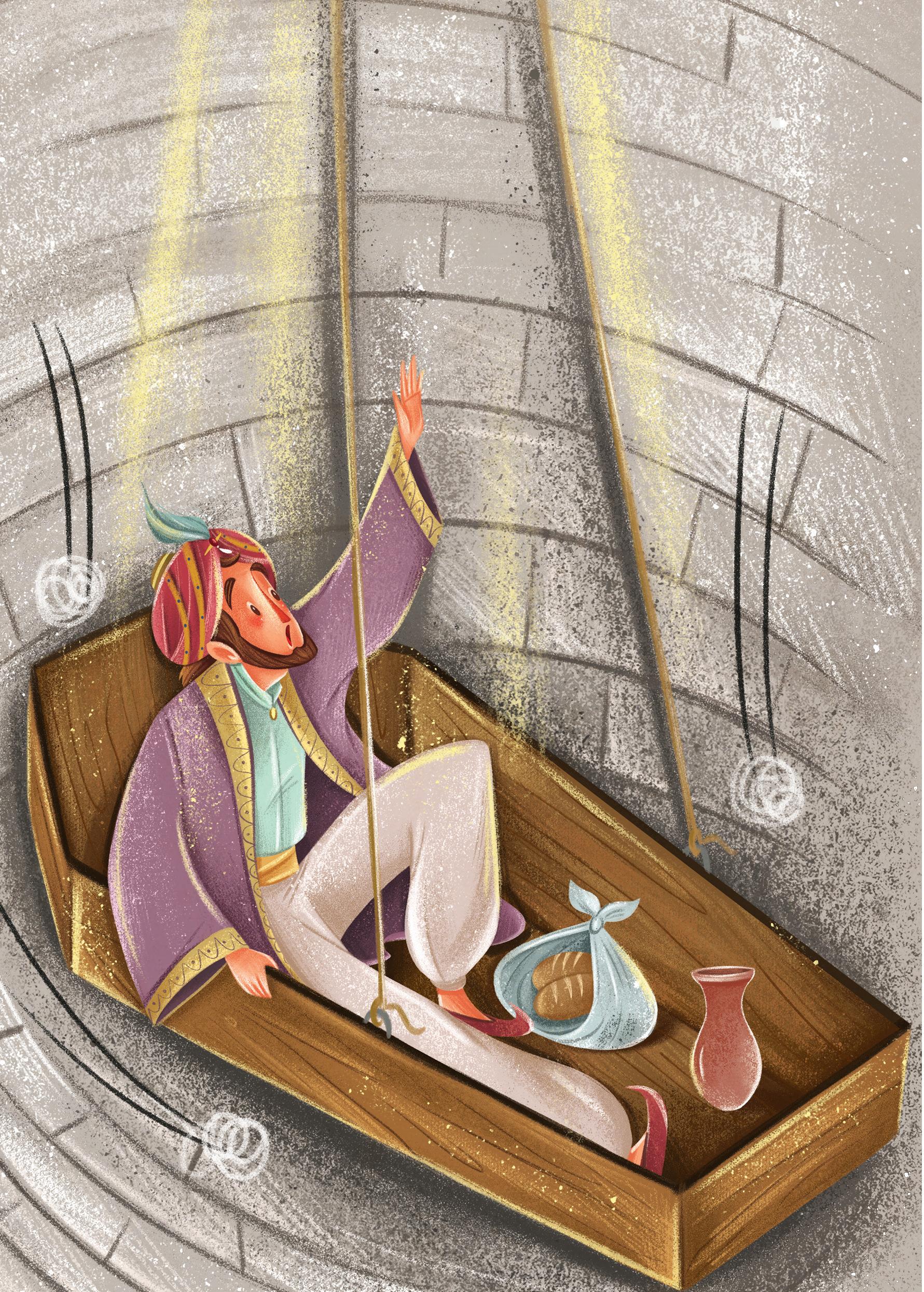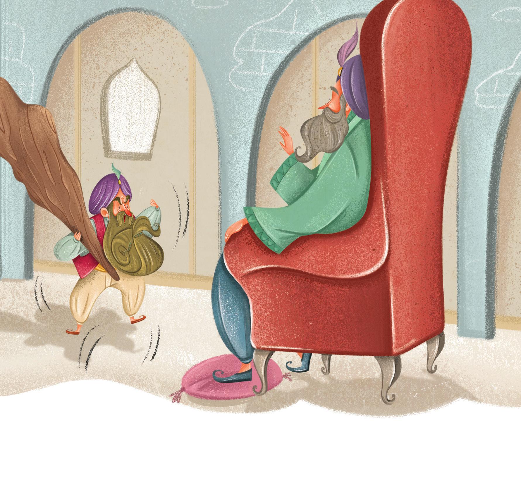 Presi dalla paura, i due re si arrampicarono in fretta fino ai rami più alti per trovare rifugio. Da lì si accorsero che la colonna scura era in realtà animata magicamente da un grosso genio dall’aria demoniaca: la terribile creatura reggeva sul capo una strana cassa di vetro.