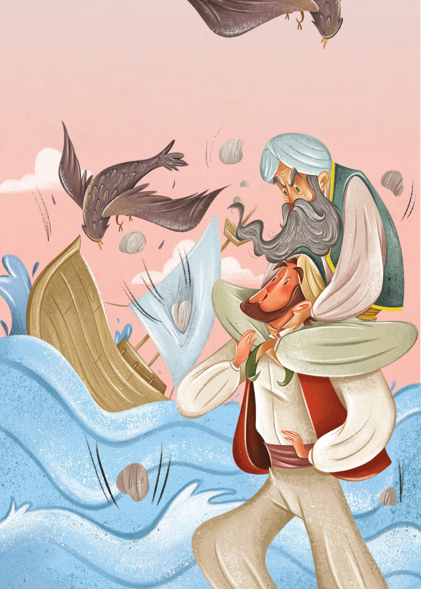 Il loro sonno fu presto turbato da un frastuono enorme che li impressionò. Videro quindi il mare alzarsi come se