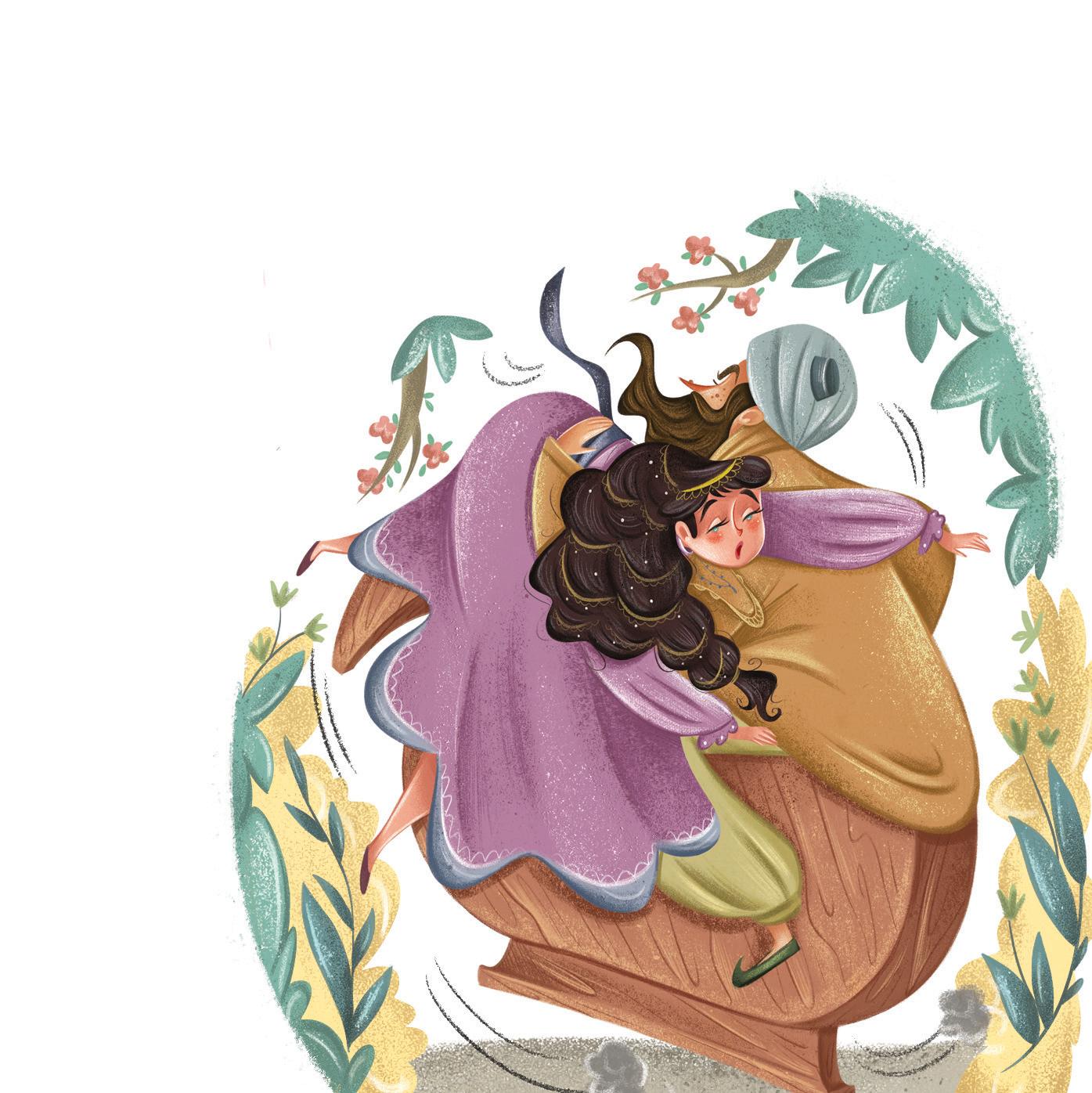 Raggiunto l’albero dov’erano appollaiati Shahriyàr e Shahzamàn, il genio poggiò la cassa a terra e da lì uscì una bellissima fanciulla di cui era evidentemente innamorato, rapita la notte delle nozze. I due re rimasero seduti finché il genio si addormentò sul grembo della sua amata. Quando lei alzò gli occhi verso la cima dell’albero, si accorse dei due fratelli che osservavano la scena sbigottiti. A Shahriyàr e Shahzamàn il fiato si ruppe in gola. Cosa sarebbe successo se anche il genio li avesse scoperti?