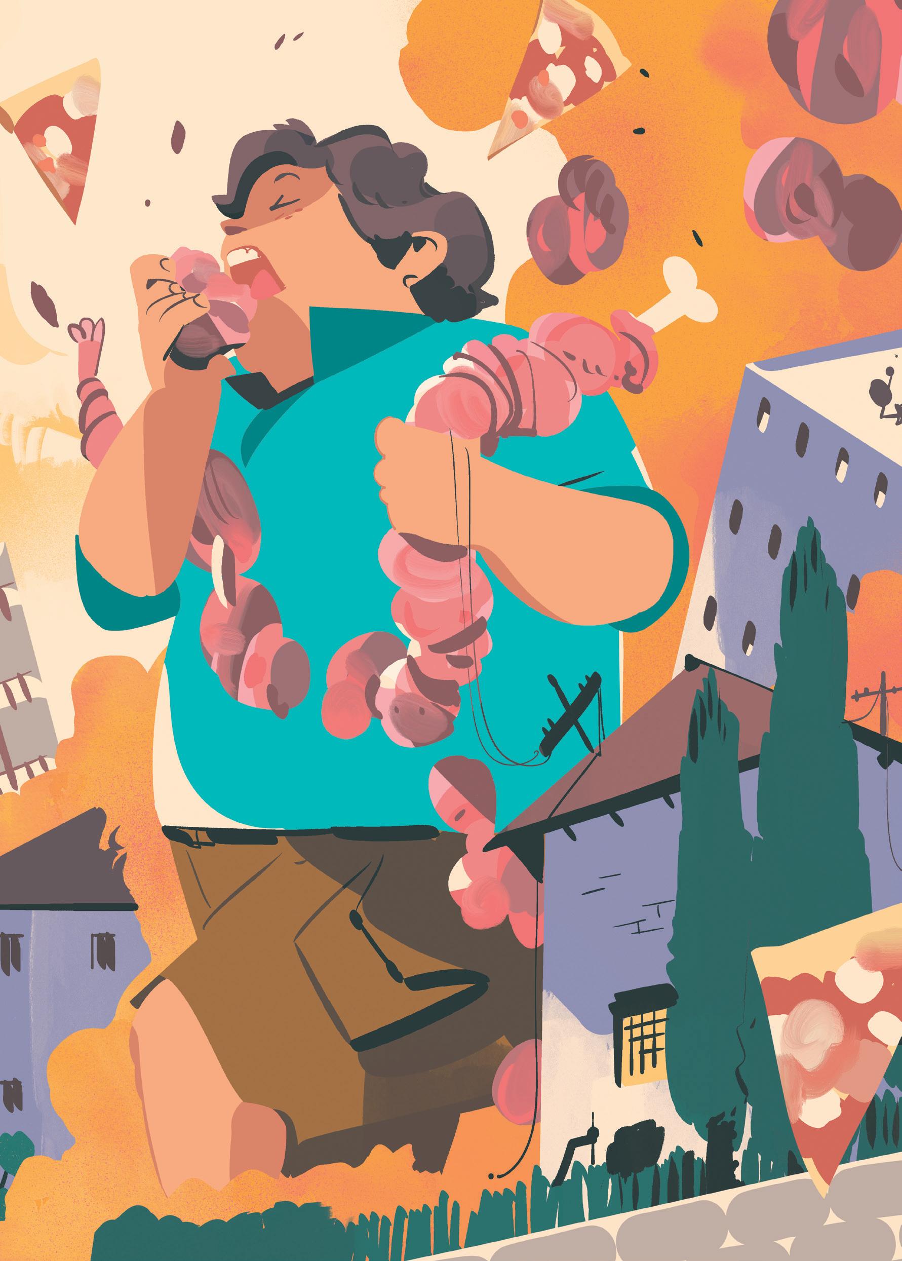 Nel frattempo, allertato dai vicini, accorse anche suo padre. Cercò subito di capire se era rimasto qualcosa da salvare, ma niente. Per giunta non era finita! Dopo quell’enorme pasto, infatti, Tommaso non era ancora sazio. Sotto gli occhi increduli dei genitori, addentò lo steccato del giardino e lo infilò nel suo stomaco senza fondo. Terminato anche quello, sentiva ancora un certo languorino, perciò si avventò sulle case dei vicini che iniziarono a scappare per la paura. Avanzando a fatica sotto il suo enorme peso, divorò non solo le abitazioni ma anche gli alberi, le strade e perfino i pali della luce. Si spinse fino alle mura della città, che addentò con gusto, mattone dopo mattone, giacché gli piacevano molto le cose croccanti.