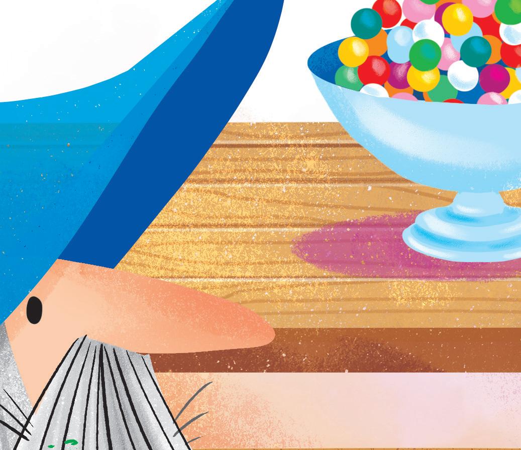 Il Mago Zuccherino era seduto dietro a un tavolo colmo di libri antichi, di recipienti di vetro e di scatole colorate. Proprio al centro del tavolo, c’era una fruttiera piena fino all’orlo di caramelle rotonde.