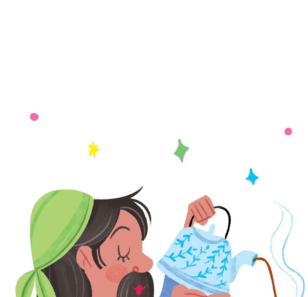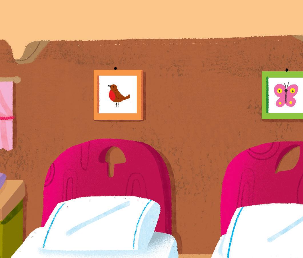 La mattina presto, quando il sole sta per sorgere e colora appena appena l’orizzonte di rosa, Piribella e Piribello si alzano, svegliati dal cinguettio di un passerotto che ha il nido fra i rami del pino. Ancora in pigiama, escono sul prato davanti casa e si lavano la faccia con una goccia di rugiada. Fanno colazione con il nettare delle genziane e poi tornano in casa per rivestirsi.
