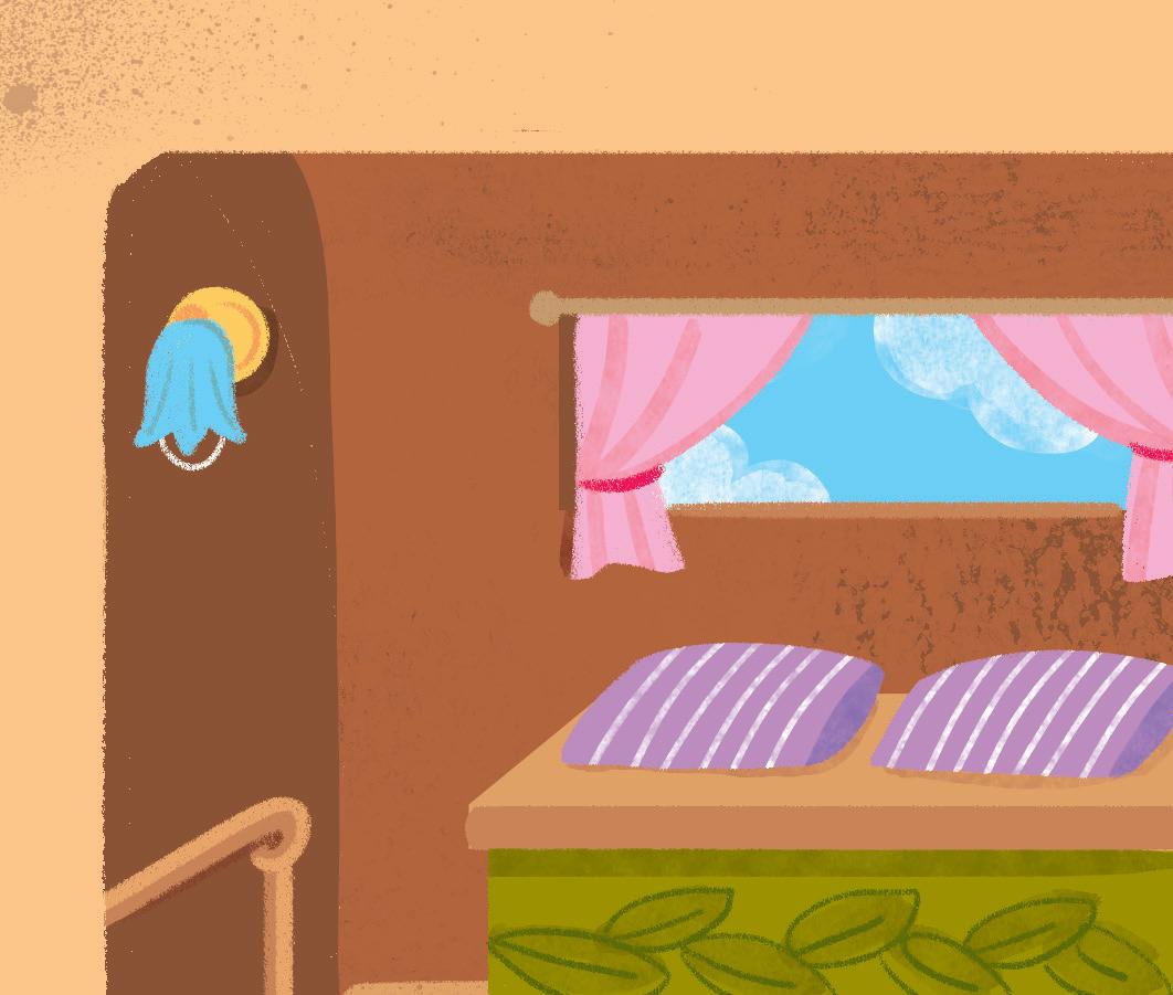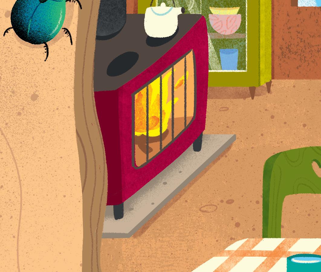 Lì dentro ci sono due stanze, una cameretta e una cucina. In cucina c’è una stufa a legna il cui camino spunta fuori dal tronco spandendo nell’aria un filo di fumo profumato. Ci sono un tavolo e due sedie, una minuscola credenza con sopra una vetrina e un vaso di fiori su una mensola. In camera ci sono due letti con bianche lenzuola e una cassapanca intagliata.