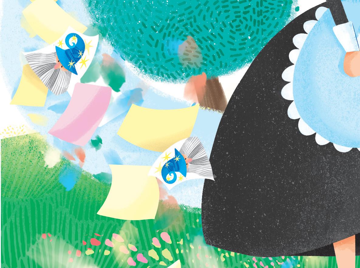 Rosa uscì di nuovo e cominciò a camminare. Le lacrime le bagnavano le guance. Cosa poteva fare lei, una povera ragazza, per quella voce orribile se neppure un dottore famoso era riuscito a rimediare? Teodora Pentagramma l’avrebbe licenziata, lei sarebbe rimasta senza stipendio e non sarebbe stato facile trovare un altro lavoro. Mentre attraversava il parco pubblico senza riuscire a farsi venire un’idea, un piccolo aeroplano rosso si mise a volteggiare sopra il prato. Rosa alzò il capo e vide cadere una pioggia di volantini colorati. Uno di questi si posò proprio davanti ai suoi piedi e lei lo raccolse. Sul volantino era disegnata la faccia di un uomo anziano dalla lunga barba, con in testa un cappello a larghe tese. C’era anche scritto: