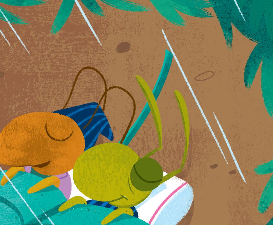 Dopo pochi minuti, un tuono formidabile lo svegliò. Il vento soffiava e la grandine cominciò a picchiettare sul prato. Il grillo fece un salto fino al soffitto della tana, tanto fu lo spavento e la cavalletta non fu da meno. Cominciò a saltare anche lei gridando:
