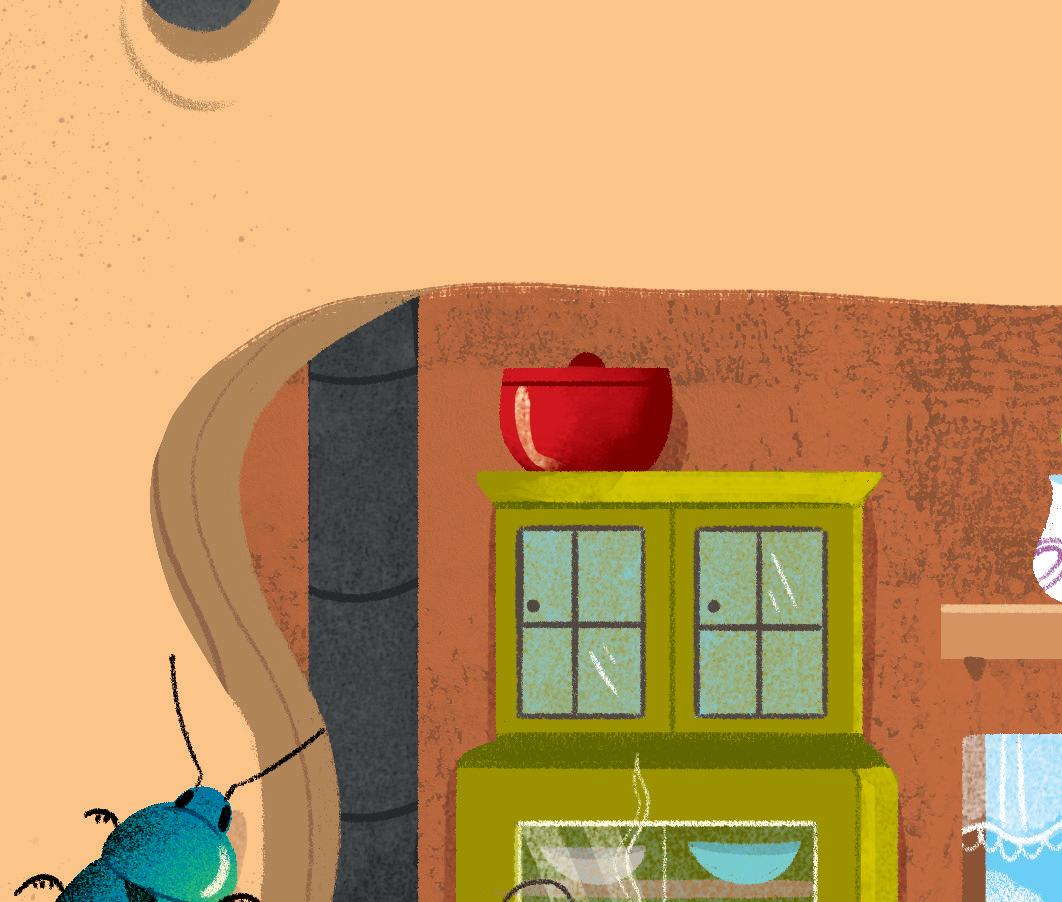 La cavalletta, rassicurata, si posò in un angolino e rimase lì buona buona per la paura di essere mandata via. Il grillo sprimacciò le foglie di menta, si distese sul letto e chiuse gli occhi. Anche questa volta però riuscì a dormire solo pochi minuti. Dalla parete, sbucò infatti una testa e poi un corpo lungo e sottile che si srotolò nella tana mentre una vocina diceva: