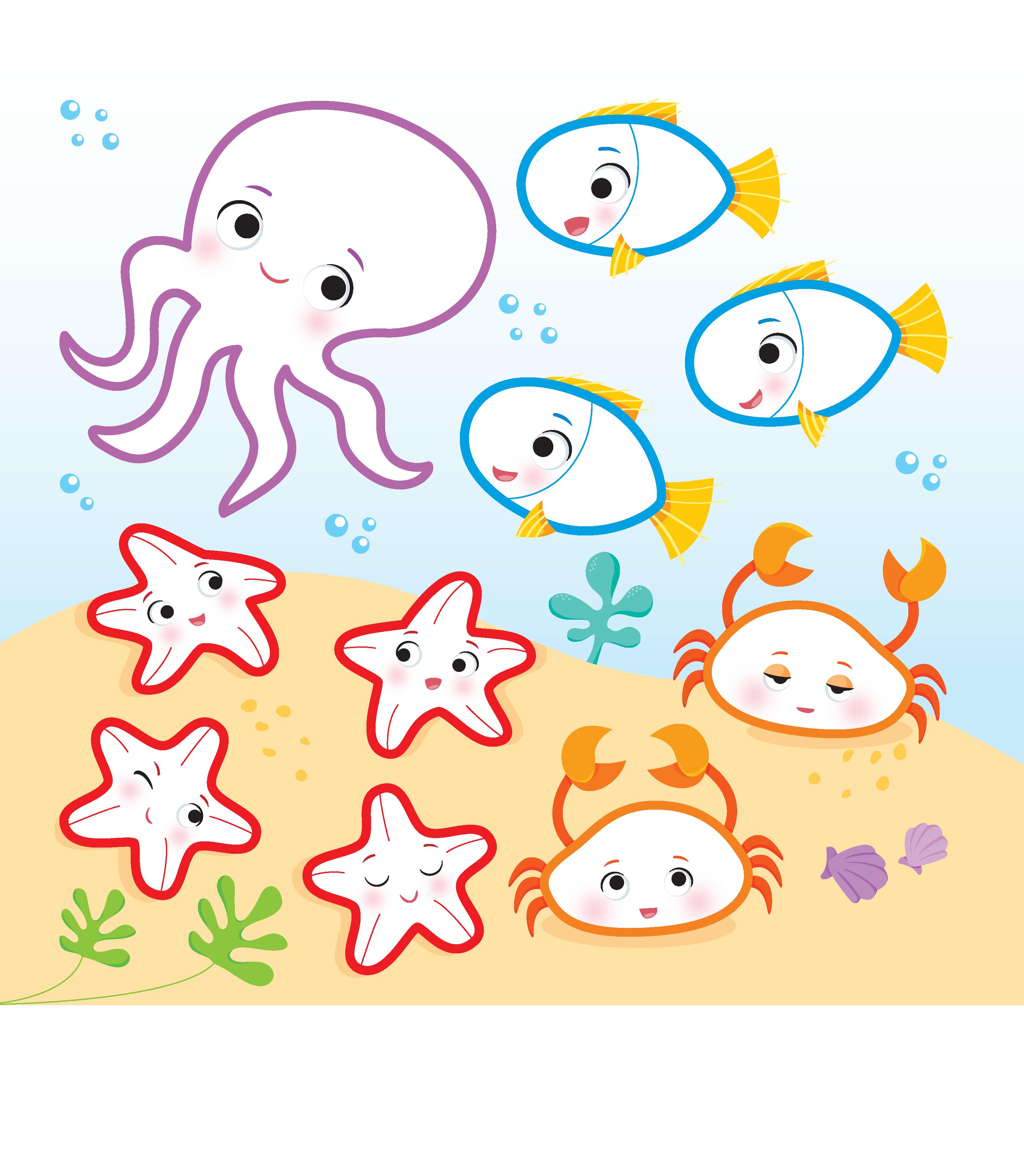9 CONTO Conta e colora 0 polpi, 1 granchio, 2 pesci e 3