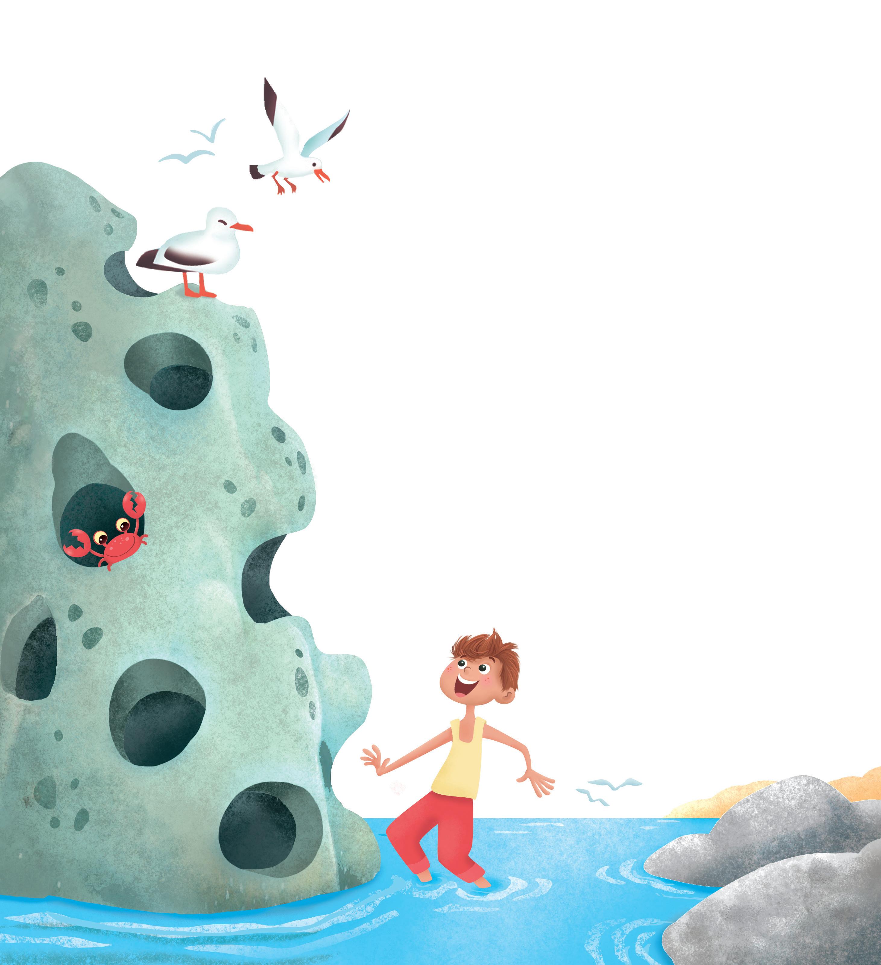 Così una mattina, durante la bassa marea, Nico sgattaiolò via. Saltò di scoglio in scoglio, e zampettò sulla sabbia bagnata. Esplorò le pozzanghere tra gli scogli. Poi notò un bagliore tra la sabbia: era un enorme scoglio pieno di buchi. Nico ci si infilò, ci saltellò intorno, lo esplorò dentro e fuori. Era un castello, un veliero, un covo di contrabbandieri.