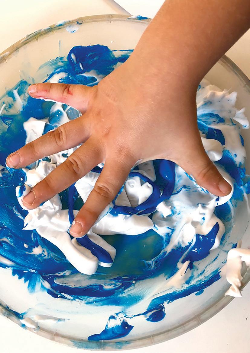 Fissiamo a parete dei grandi fogli di carta quindi predisponiamo le tempere di differenti colori mescolate con un po’ di schiuma da barba e diamo ai bambini il comando di dipingere l’intero foglio utilizzando entrambe le mani, riempendo perciò interamente lo spazio.