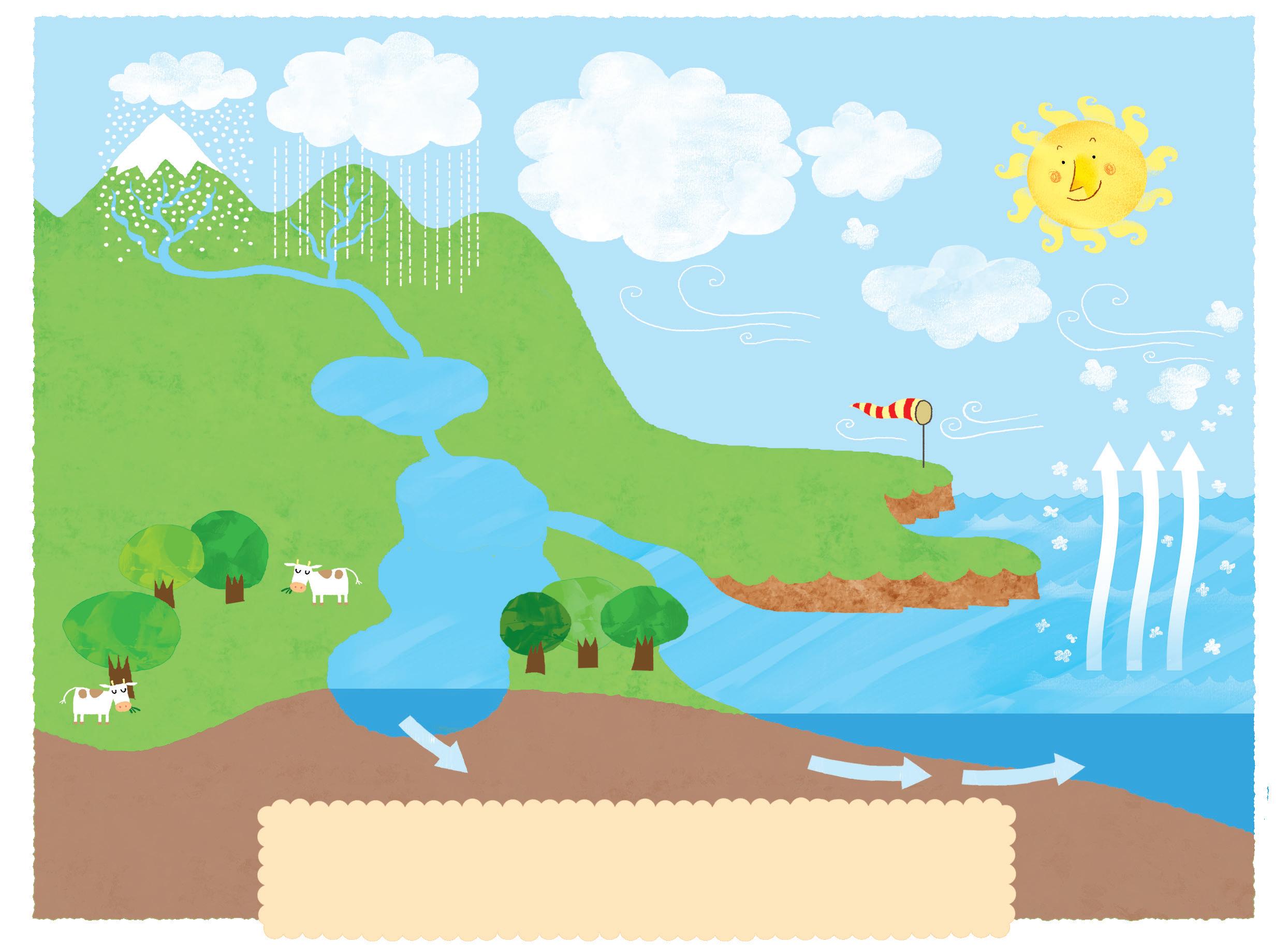 3 Ma da dove viene l’acqua? Perché sembra non finire? Completa il ciclo dell’acqua inserendo le parole adatte nei riquadri. laghi • evaporazione • mari • ghiacciai • acque sotterranee • precipitazioni