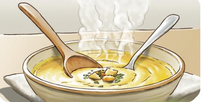 A Un cucchiaio di metallo e uno di legno sono appoggiati nella minestra fumante.