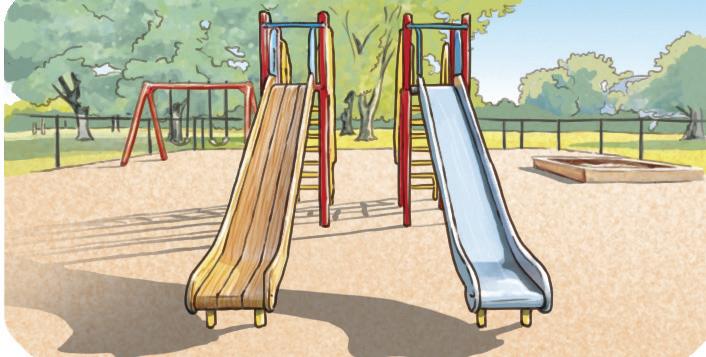 B Al parco giochi ci sono due scivoli, uno con il fondo di plastica e uno con il fondo di acciaio. C’è un Sole forte.