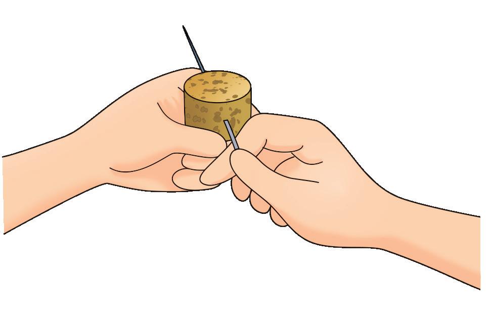 2. Inserisci orizzontalmente l’ago nel pezzo di sughero in modo che penetri da un lato ed esca dall’altro in modo simmetrico.