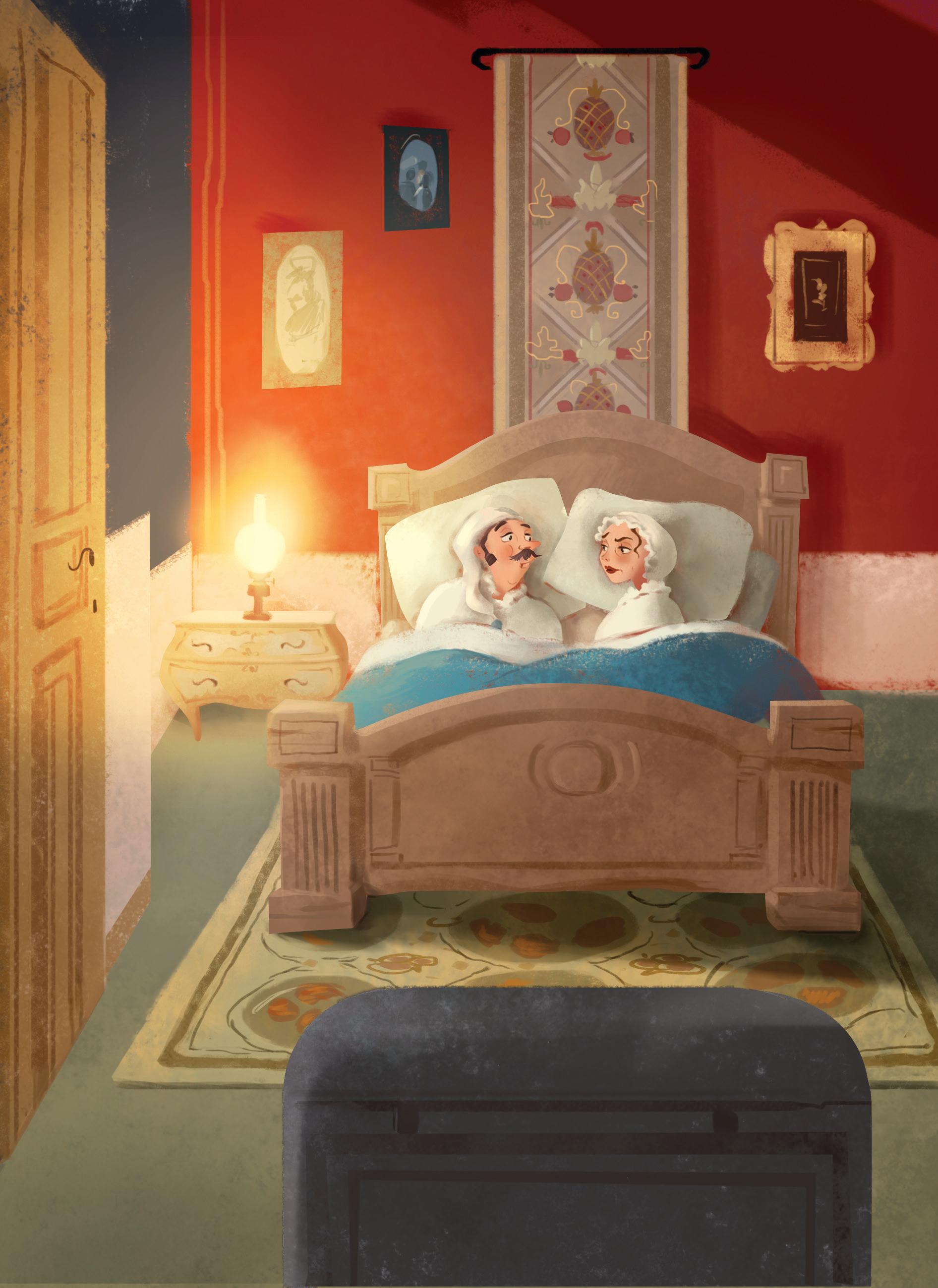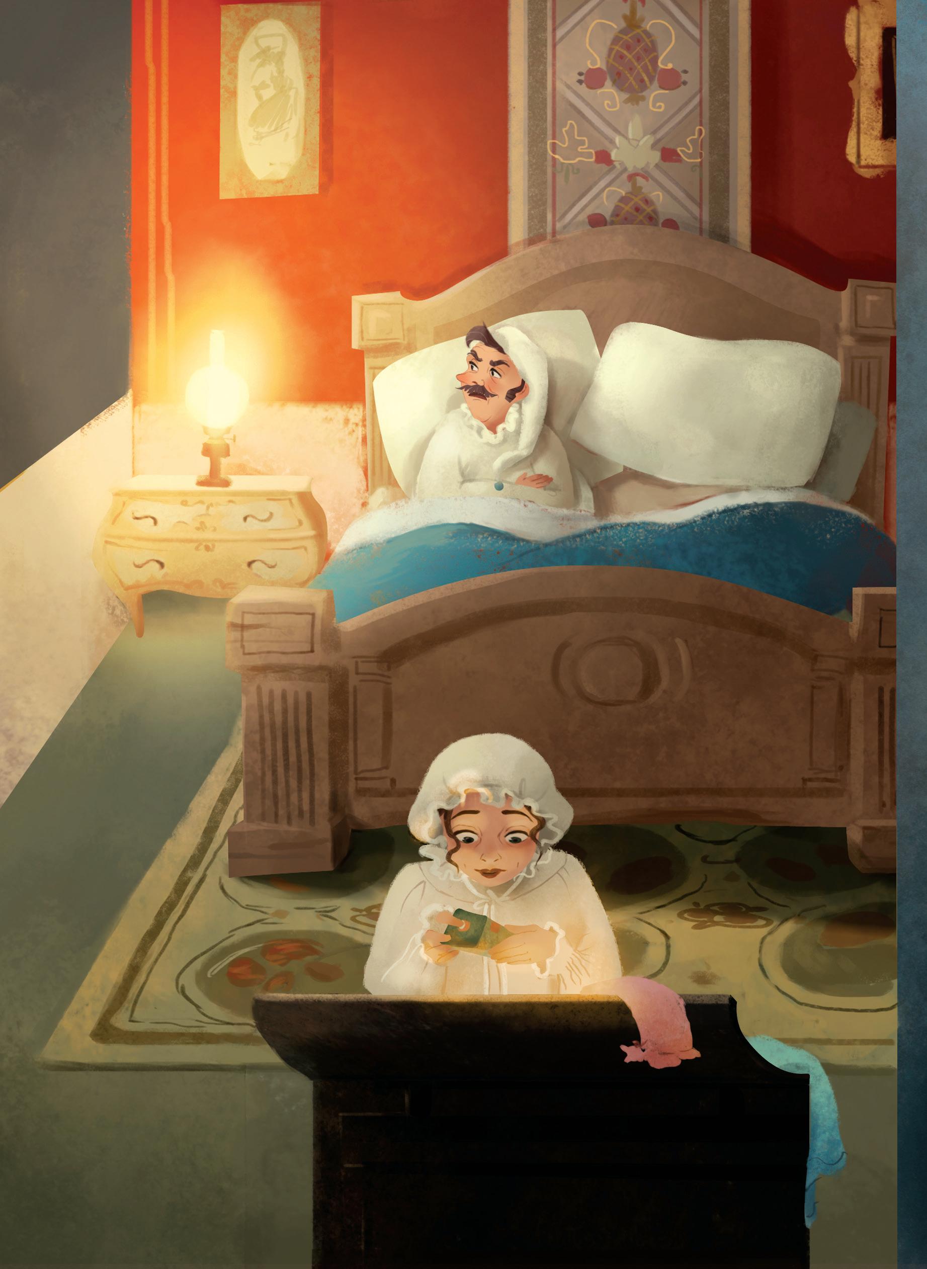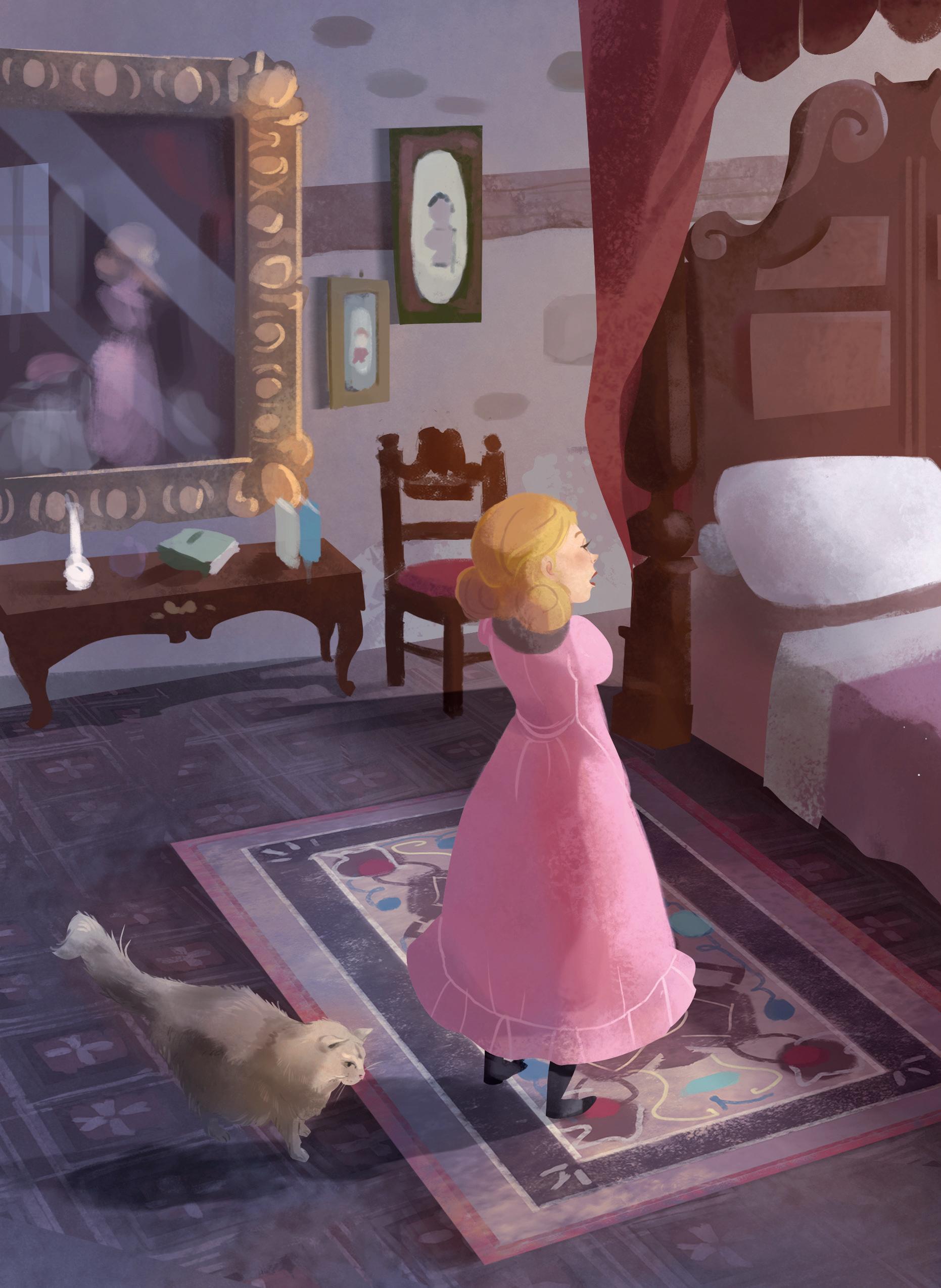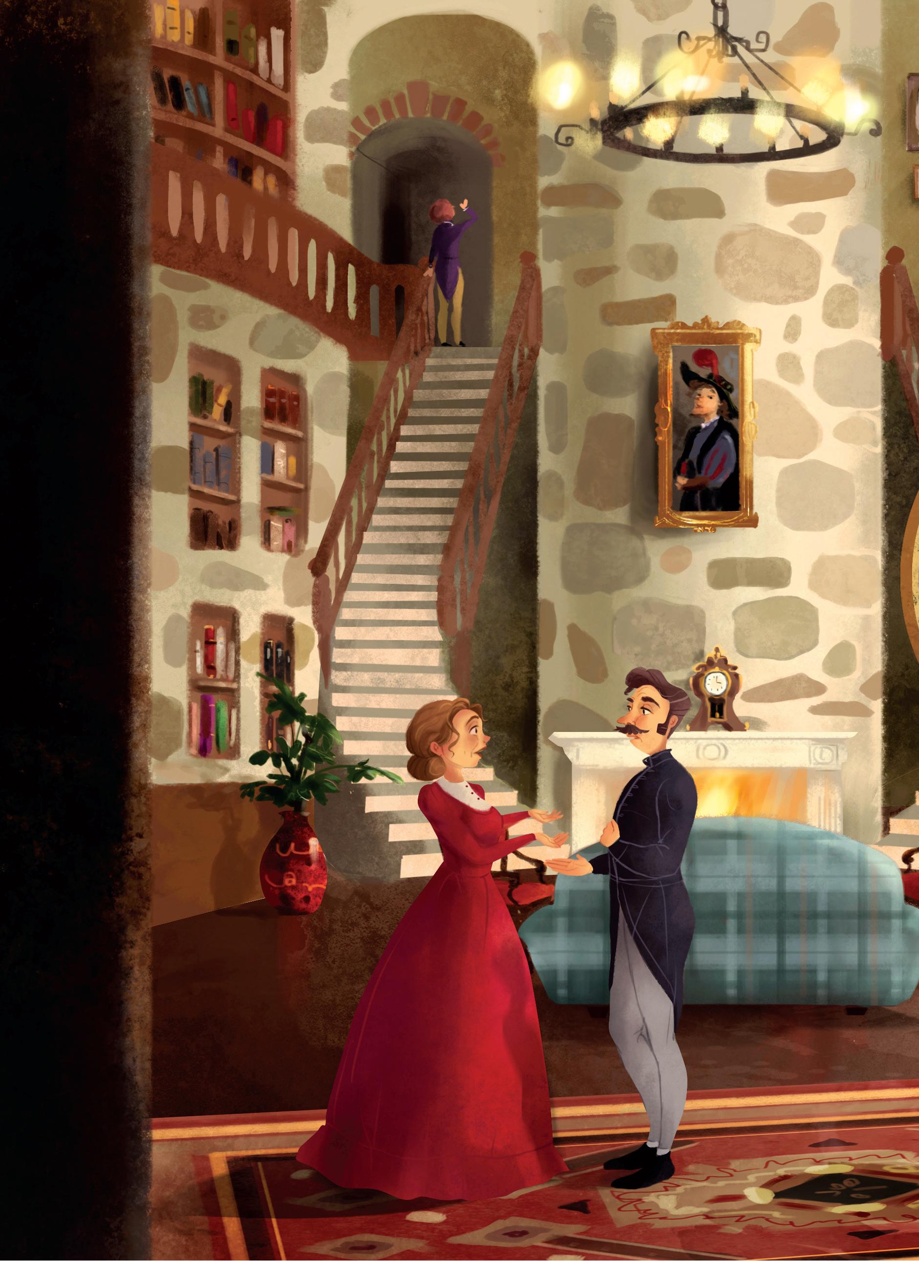 Then in his bedroom he feels very sad, because he can’t scare anybody. Virginia hears him crying. She goes to the tower. “What’s the matter?” she asks.
