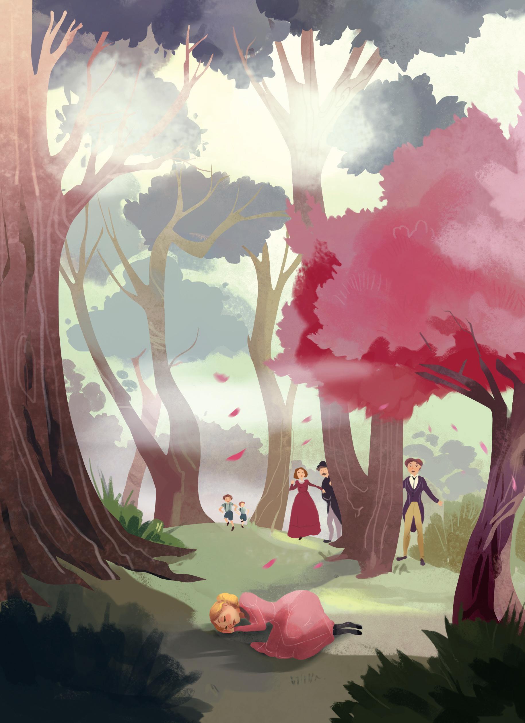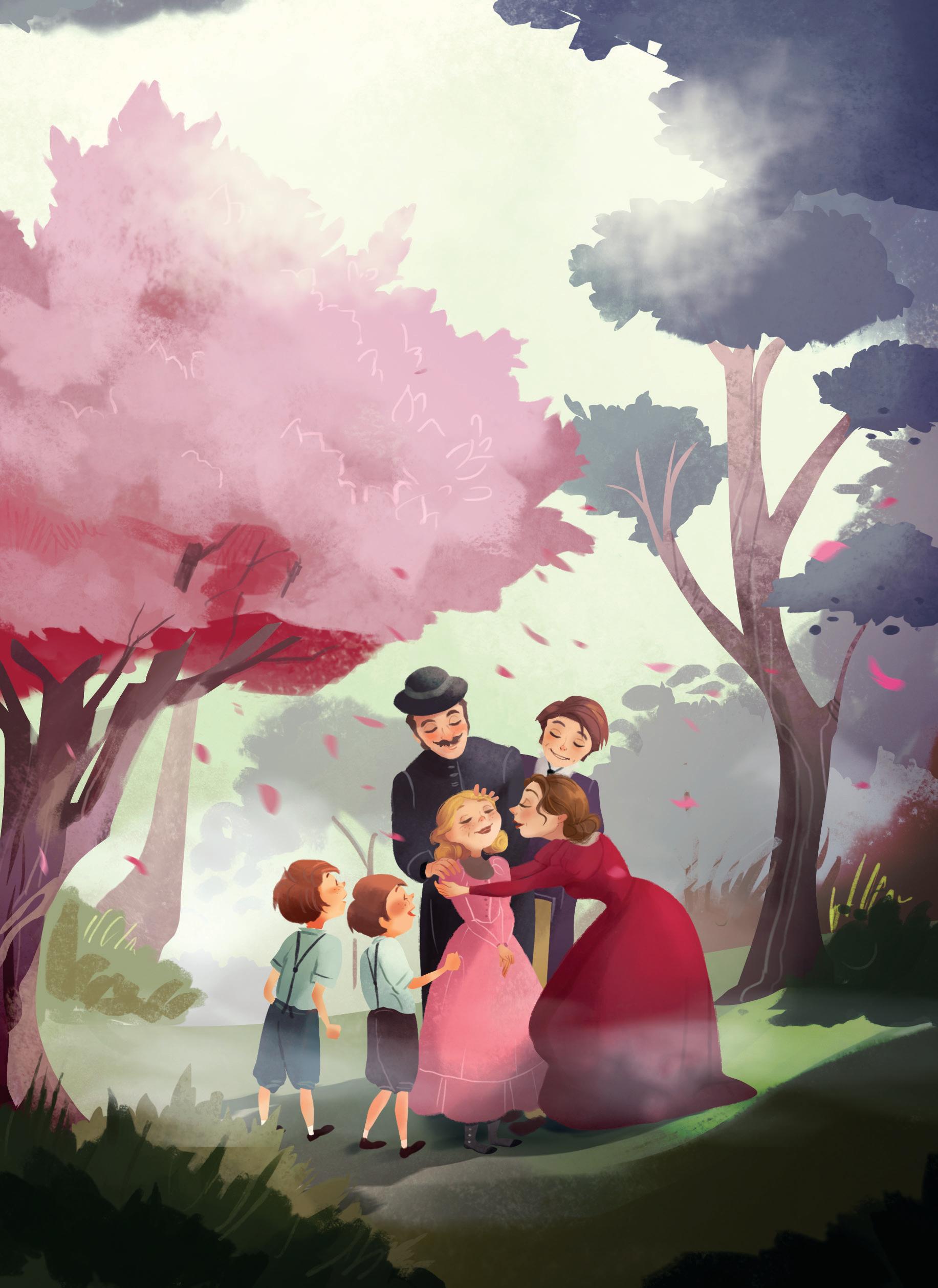 At last they see her by the almond tree. She’s sleeping and the almond tree is full of flowers.