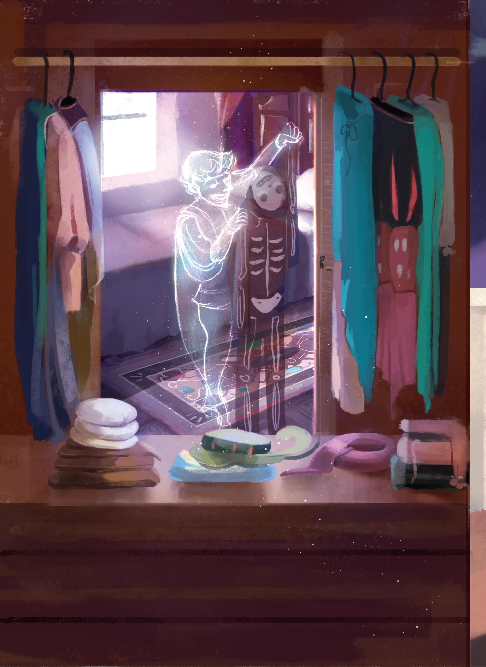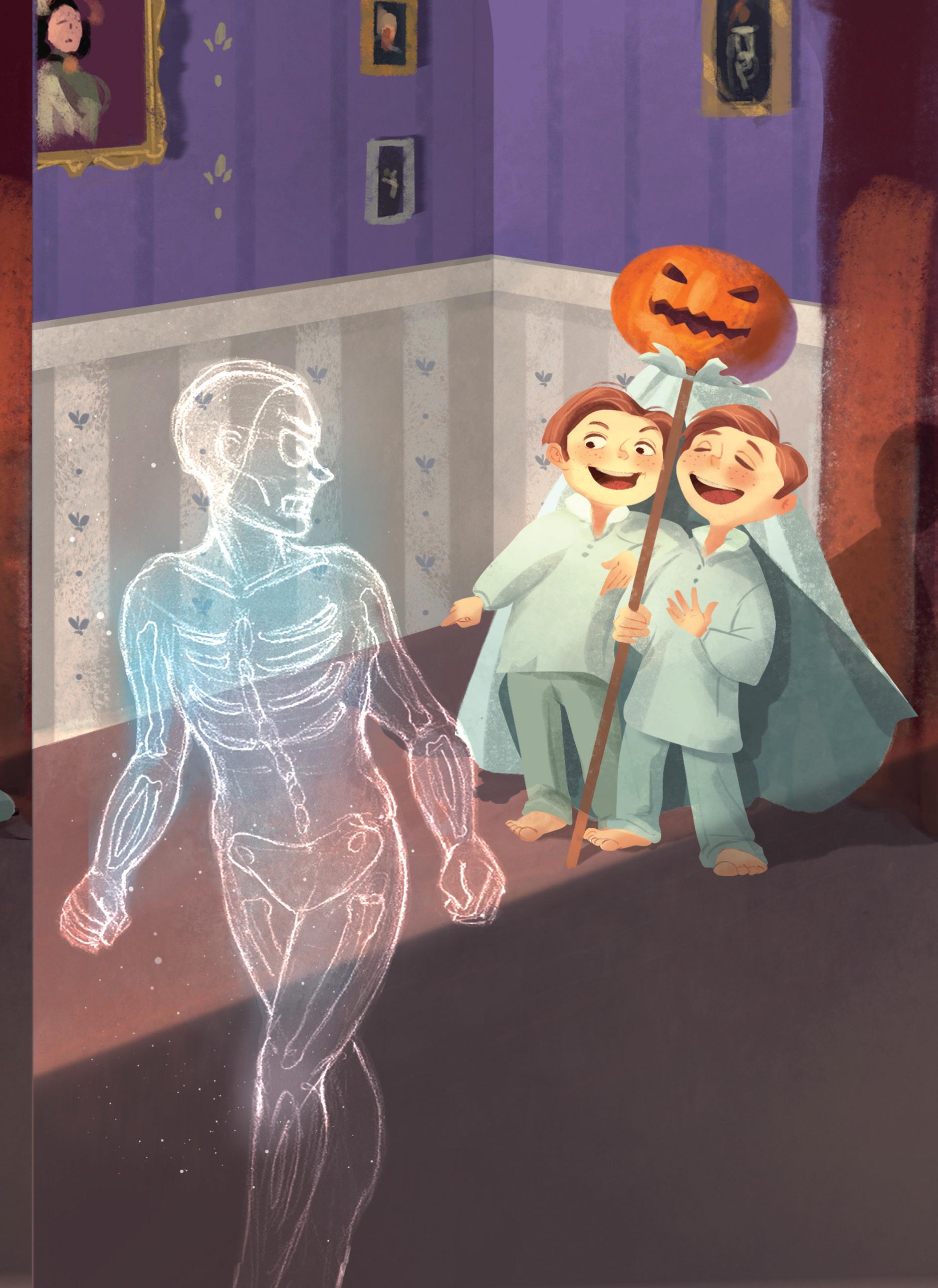 The next evening he thinks, “I’m going to frighten the twins!” He puts on an old skeleton costume and goes to their bedroom.