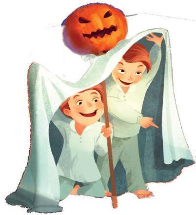 Suddenly the twins appear from behind the white sheet. They are playing a trick on Sir Simon. “Ha ha ha!” they laugh and point at the scary face.