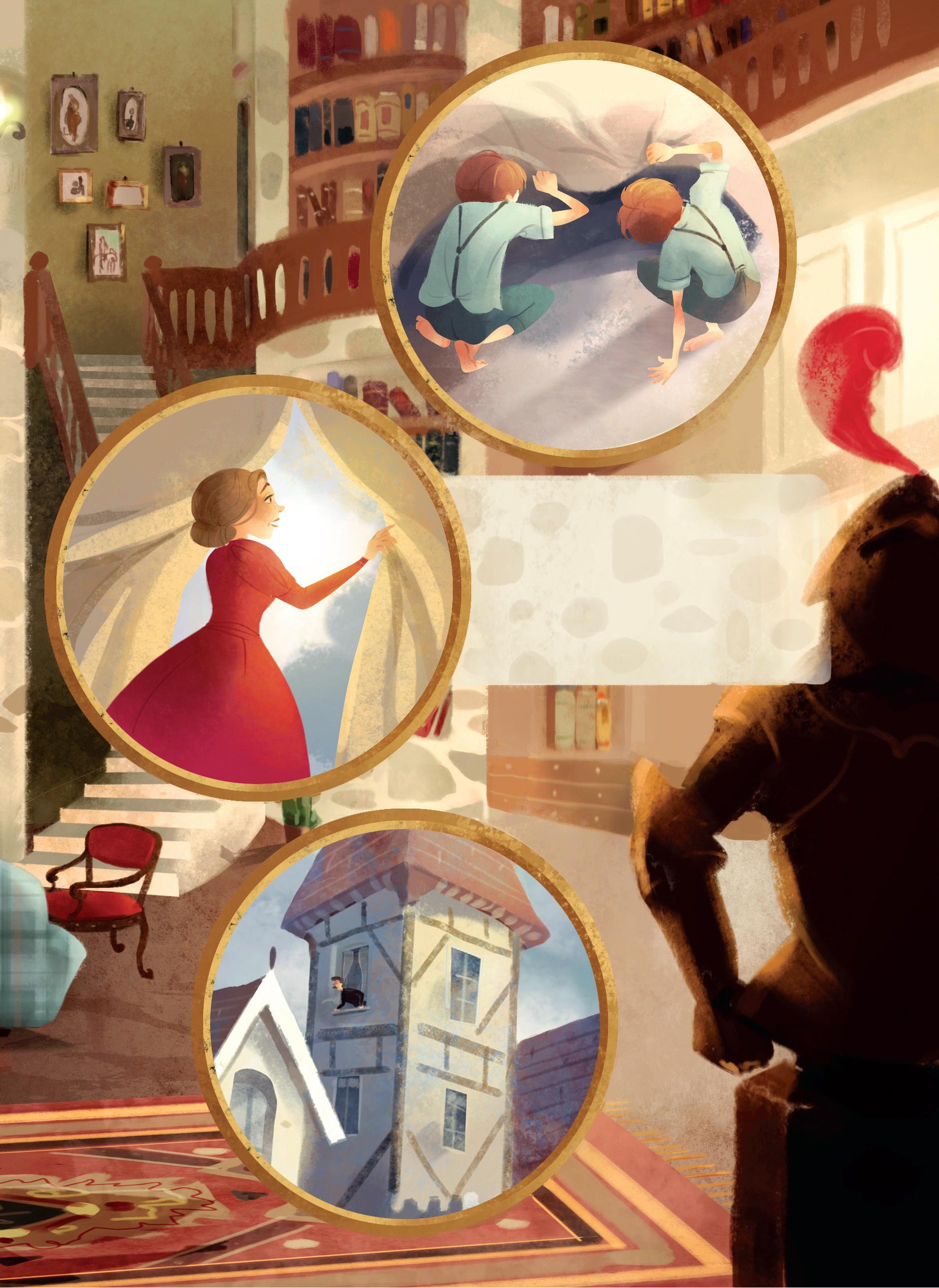 They look everywhere; under the beds... behind the curtains... in the tower... but they can’t find her.