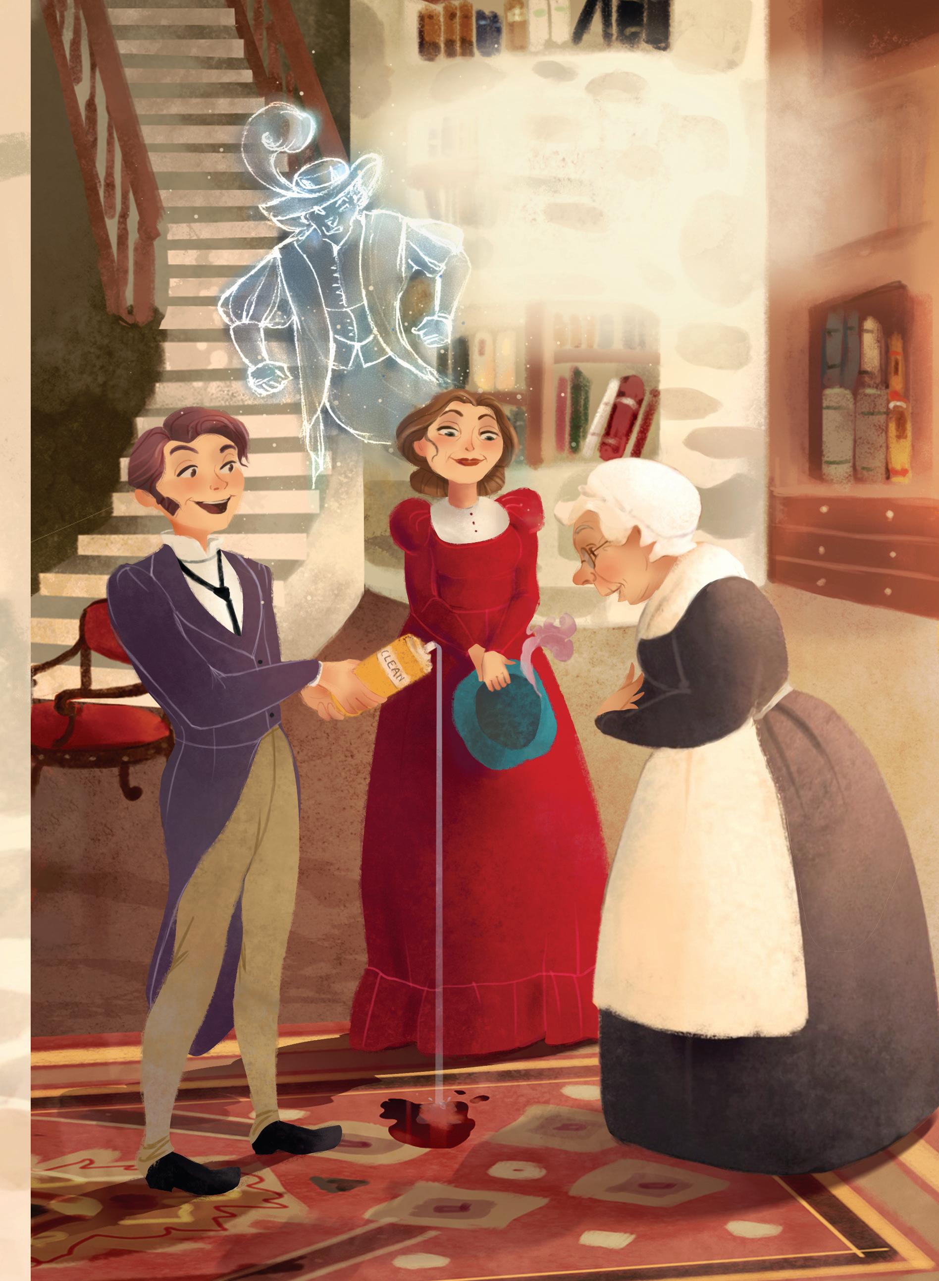 At Canterville Chase they meet Mrs Umney, the housekeeper. Mrs Umney takes them to the library. Mrs Otis sees a red stain on the floor. “What’s that?” she asks.