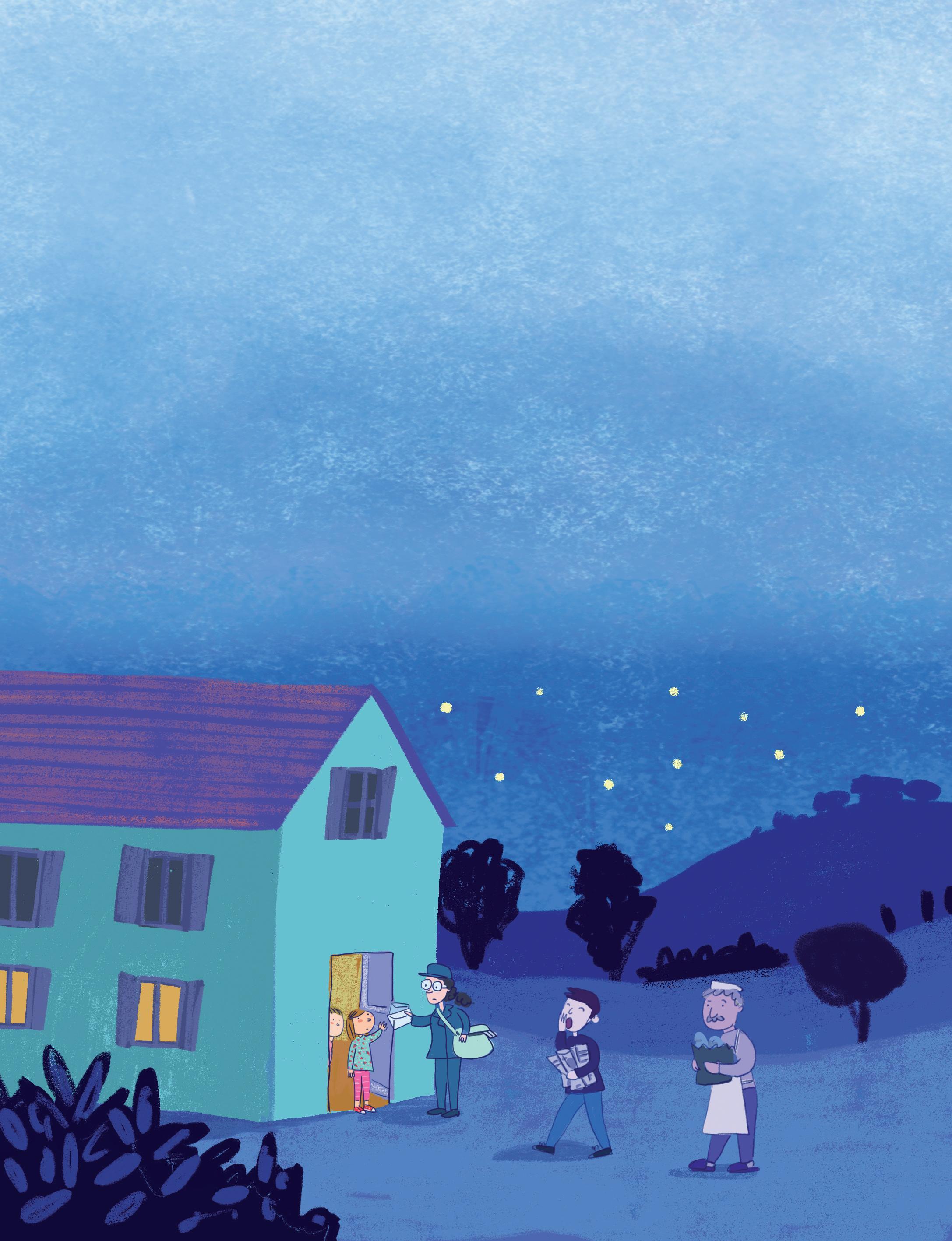 È la postina che consegna la posta in piena notte; con lei c’è il giornalaio col giornale e il fornaio che consegna il pane…