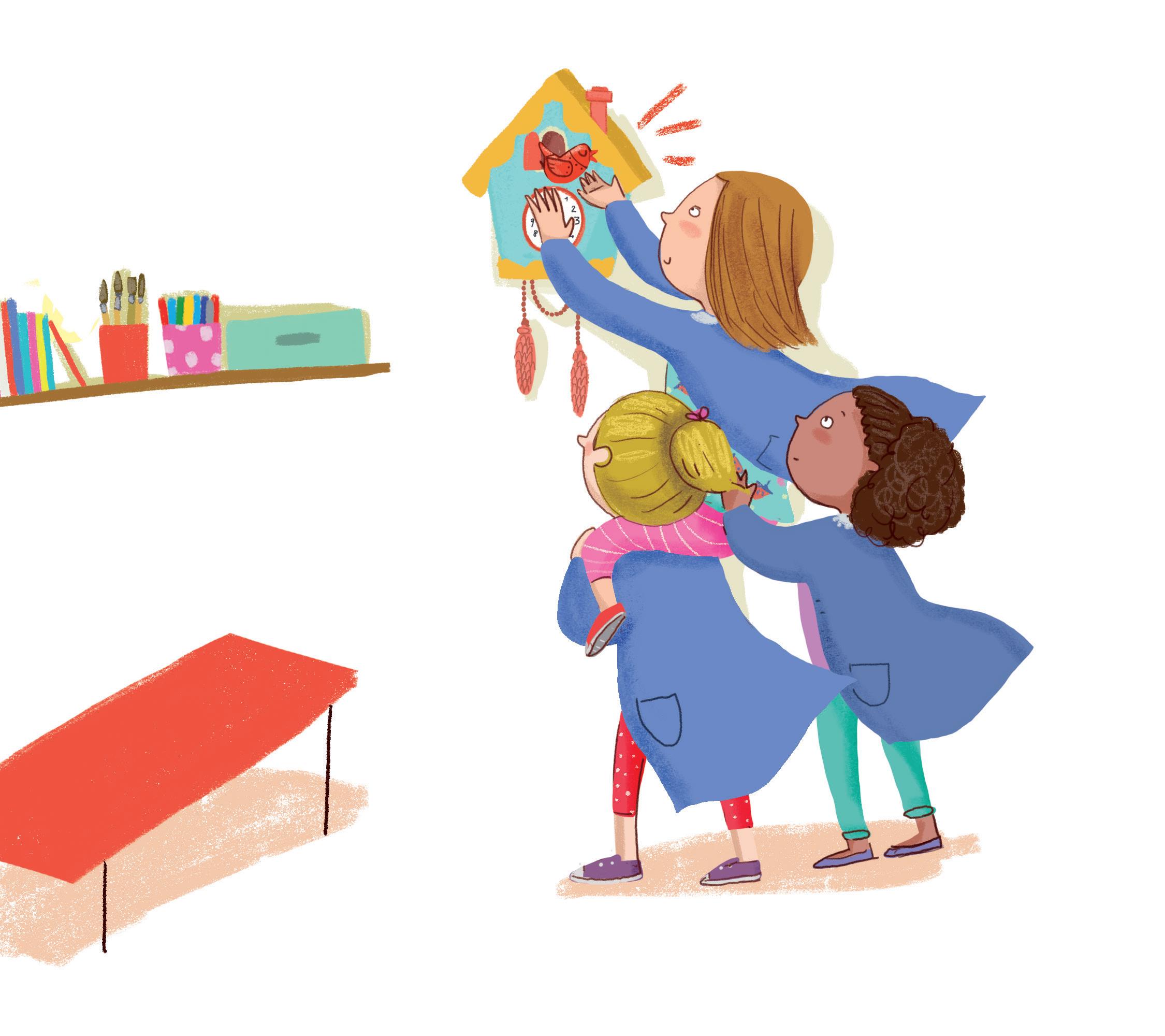 – Se non sapete riconoscere l’ora non potete giocare! Lavoreremo sull’orologio finché alle dieci, ora della ricreazione, il cucù non suonerà. Pochi minuti per mangiare, poi di nuovo al lavoro fino a mezzogiorno! Dunque, adesso è l’ora del lavoro!