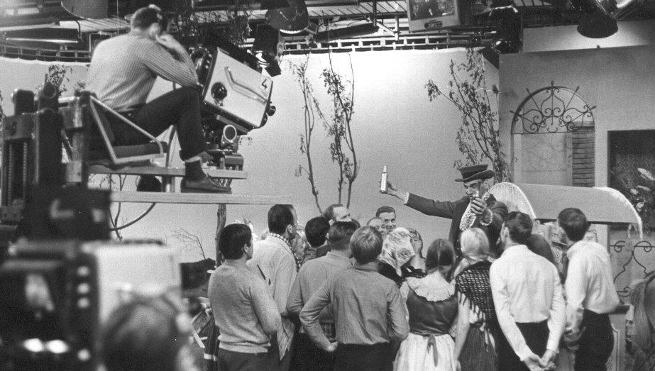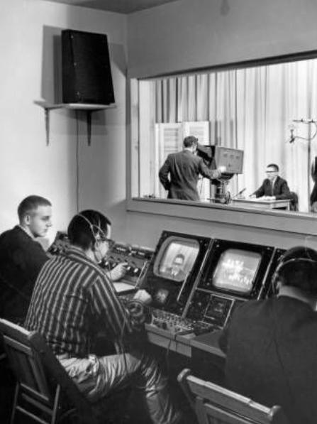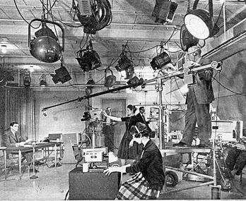 Myndstjórn og upptökusalur í bandarískri sjónvarpsstöð árið 1954. Tækið að neðan er Zenith Flashmatic, árgerð 1955.