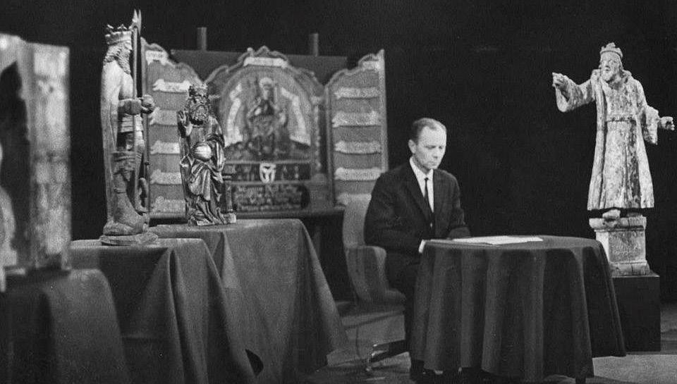 Önnur háskastund rann upp í þættinum “Á öndverðum meiði”. Þá deildu um spíritisma þeir séra Sveinn Víkingur og Páll Kolka, læknir. Þeir börðu í borðið án afláts. En því miður var borðplatan veigalítil krossviðsplata. Í ofanálag var hljóðneminn rekinn upp um gat á miðri plötunni, sem skalf og nötraði með feiknalegum hávaða sem kæfði allt mannamál við borðið meðan skjálftarnir stóðu yfir. Andi hlaupinn í borðplötuna? Guðmundur Guðjónsson, óperusöngvari og sviðsstjóri Sjónvarpsins, gaf létt merki með látbragði eins og úr óperettu og róaði menn hæfilega niður. Guðmundur var einstakur að vinna með. Ávallt velviljaður og þægilegur, tilbúinn til að liðsinna fólki sem var óöruggt með sig þegar það kom í upptökur.