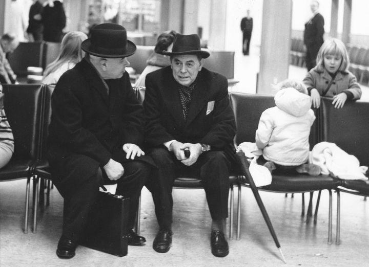 Í biðsal gömlu flugstöðvarinnar á Keflavíkurflugvelli. Beðið eftir útkalli til brottfarar. Forsætisráðherra og utanríkisráðherra Íslands á leið til fundar með erlendum ráðamönnum.