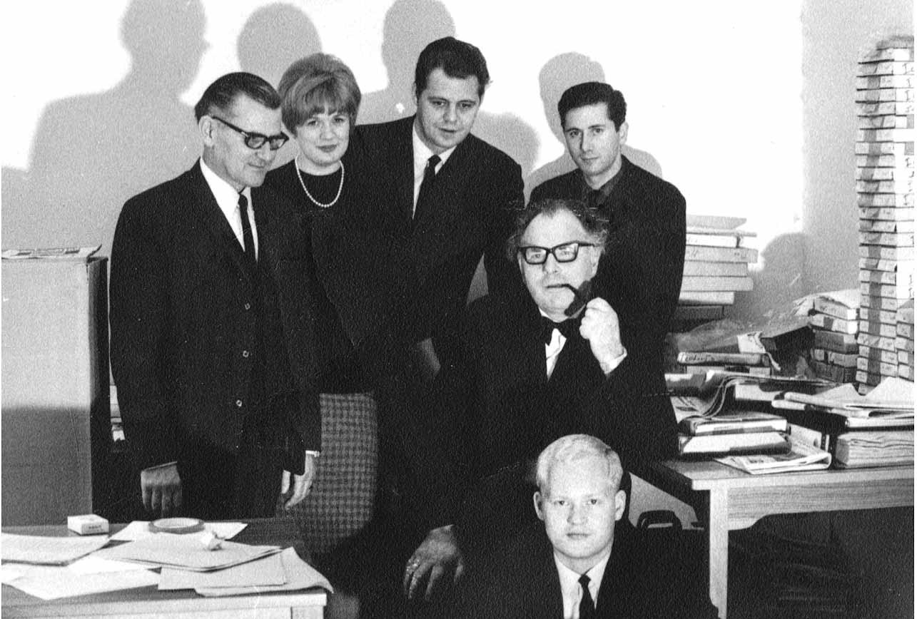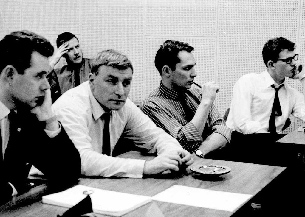 Myndstjórn til hliðar við upptökusalinn á Laugaveginum. Karl Jeppesen, tímavörður, Markús útsendingarstjóri, Helgi Sveinbjörnsson annaðist myndblöndun, Jón Hermannsson, tæknistjóri, og Ingvi Hjörleifsson, ljósameistari.