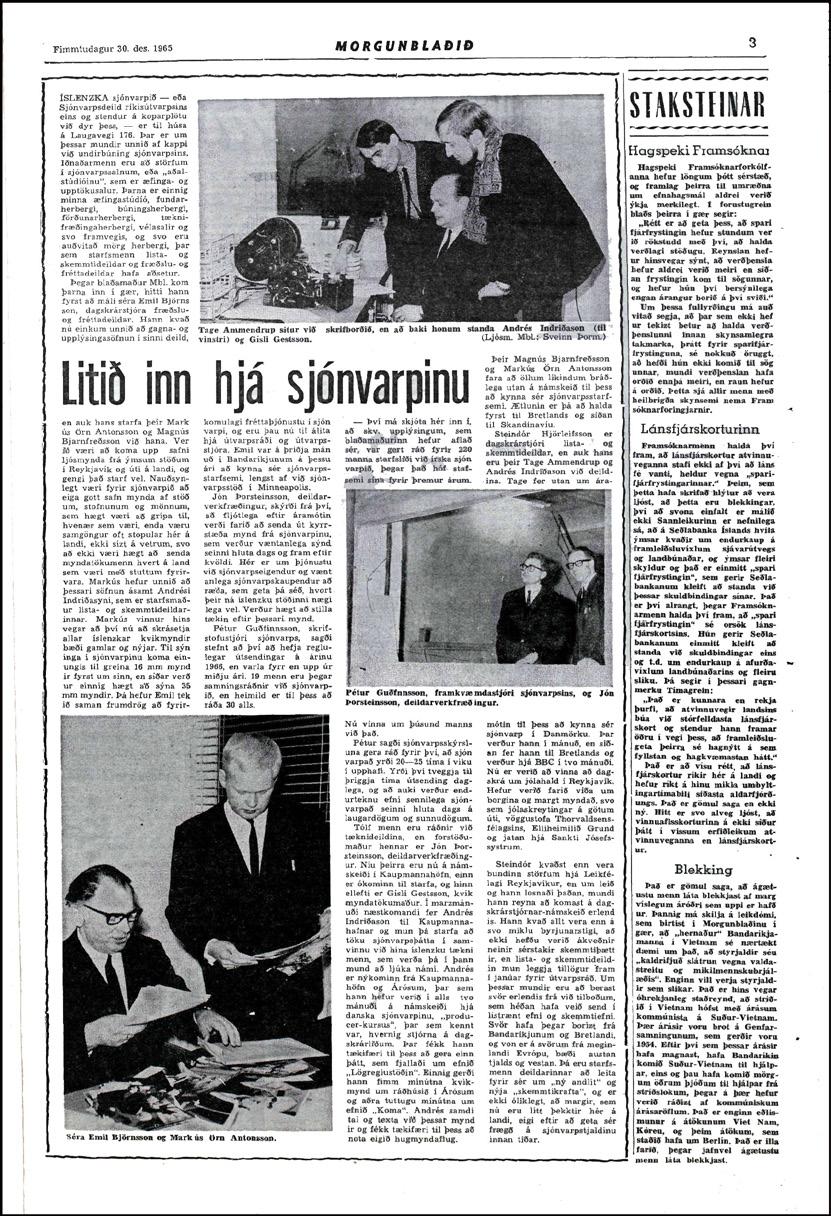 útvarpsins. Annað stærsta framfaramál þess er að hefja sjónvarp hér á landi. Sjónvarpið ryður sér nú hvarvetna til rúms meðal menningarþjóða. Er þar áreiðanlega um að ræða eitt hið merkasta menningartæki nútímans, enda þótt það hafi sums staðar verið misnotað og ekki gefið eins góða raun og mátt hefði ætla.”