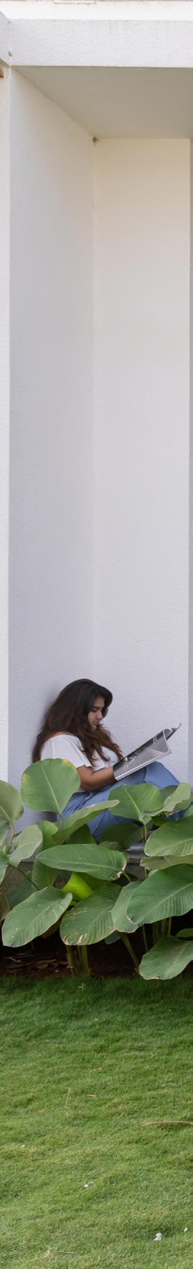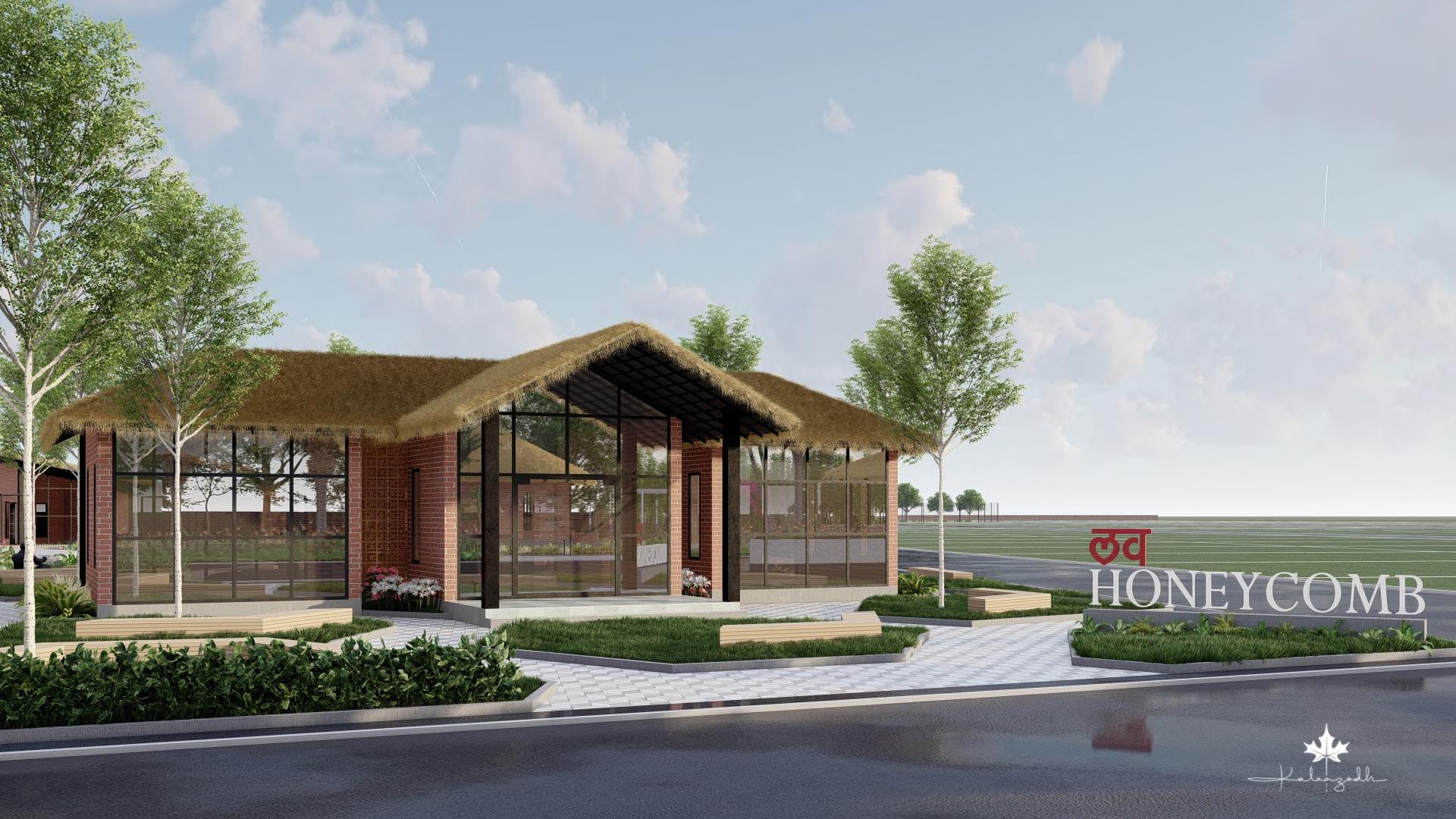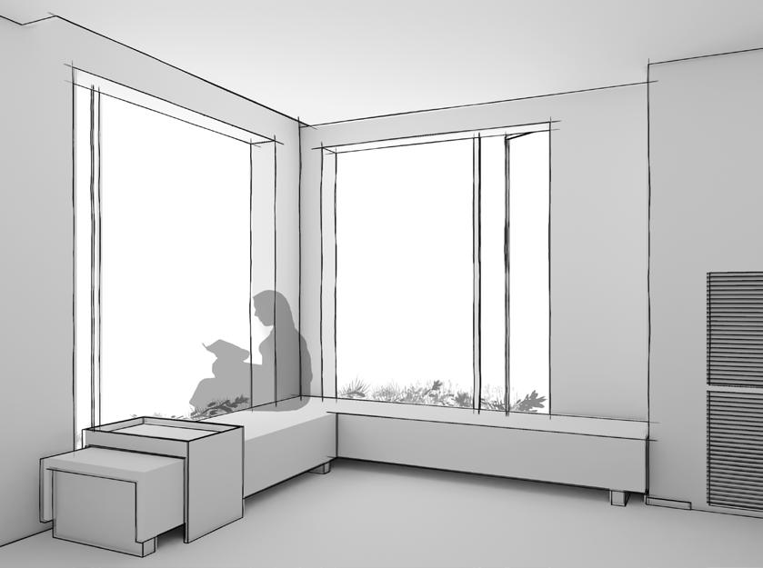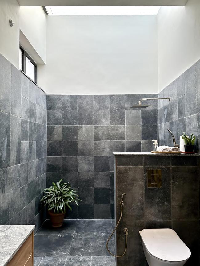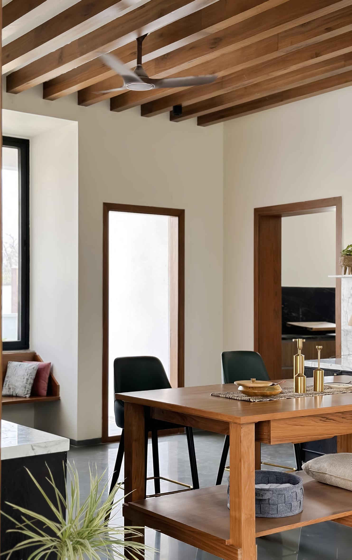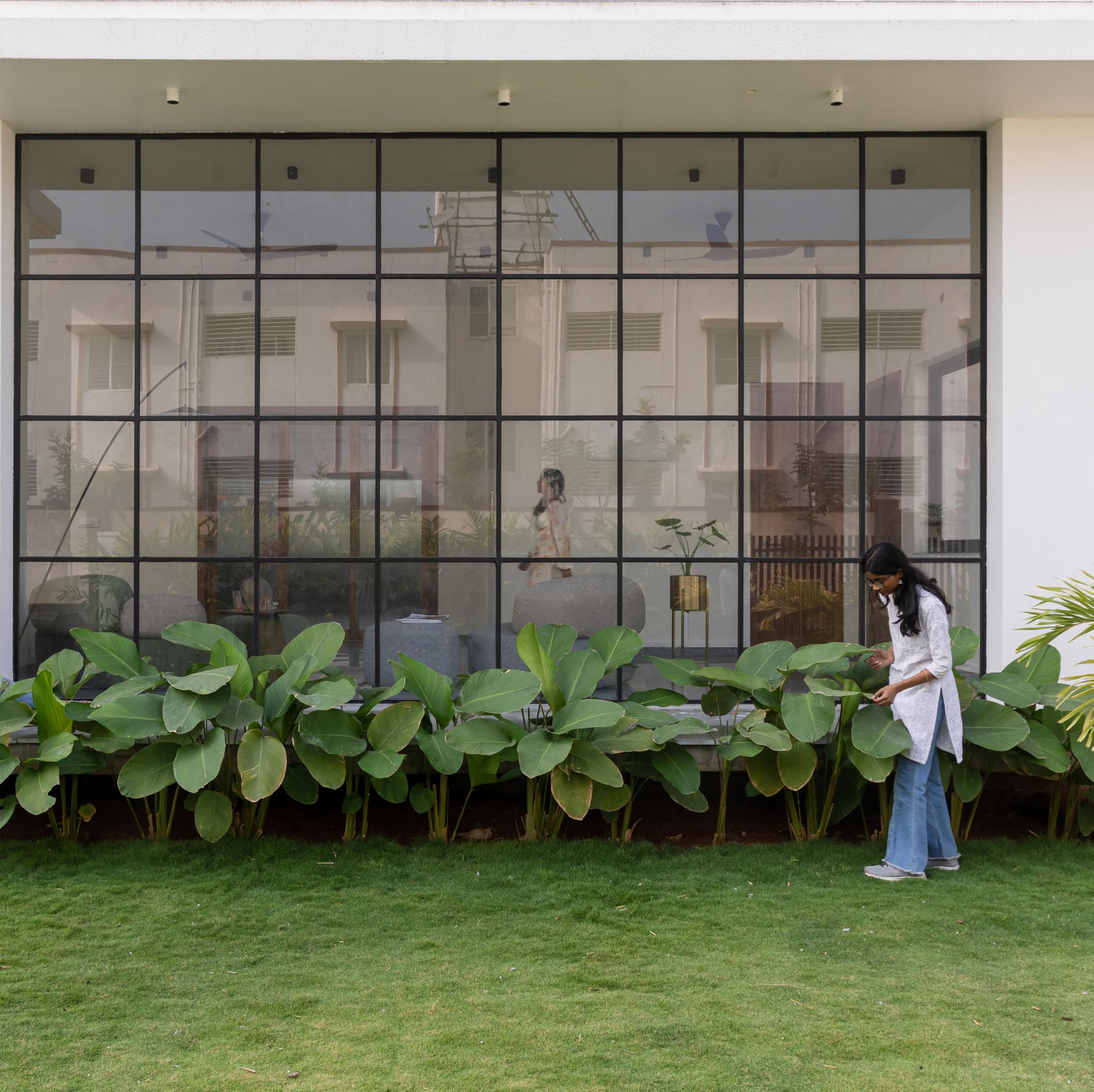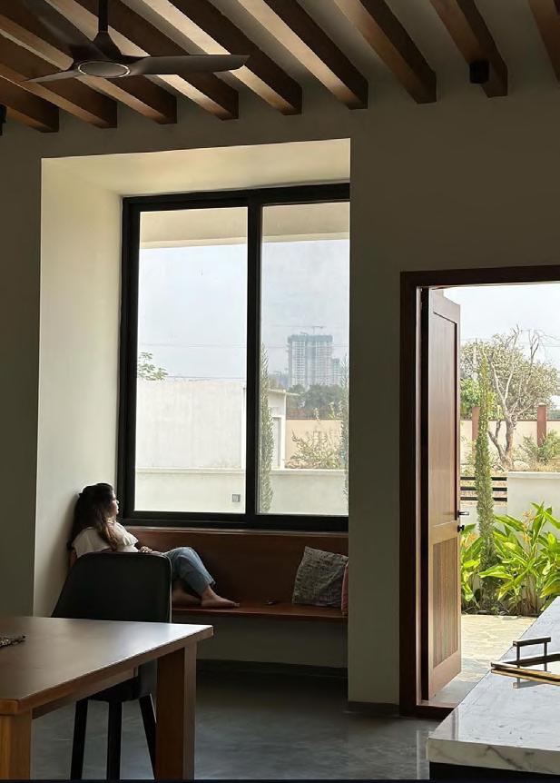 The grid window epitomizes a harmonious blend of functionality, aesthetic elegance, filtering natural light to create a soft, warm interior ambiance while serving as a striking architectural element that enhances the façade. This thoughtful design fosters a visual connection with nature, ensuring occupant privacy, and adds depth and character through the interplay of light and shadow. The grid window’s projected chajja provides sunshade, merging seamlessly into a wall, and incorporates a seating platform, forming a unique C-frame niche. This inviting space allows occupants to experience two distinct environments - the vibrant outdoors and serene indoors - divided only by the grid window, beautifully reflecting the balance between modern living and the surrounding serene environment.