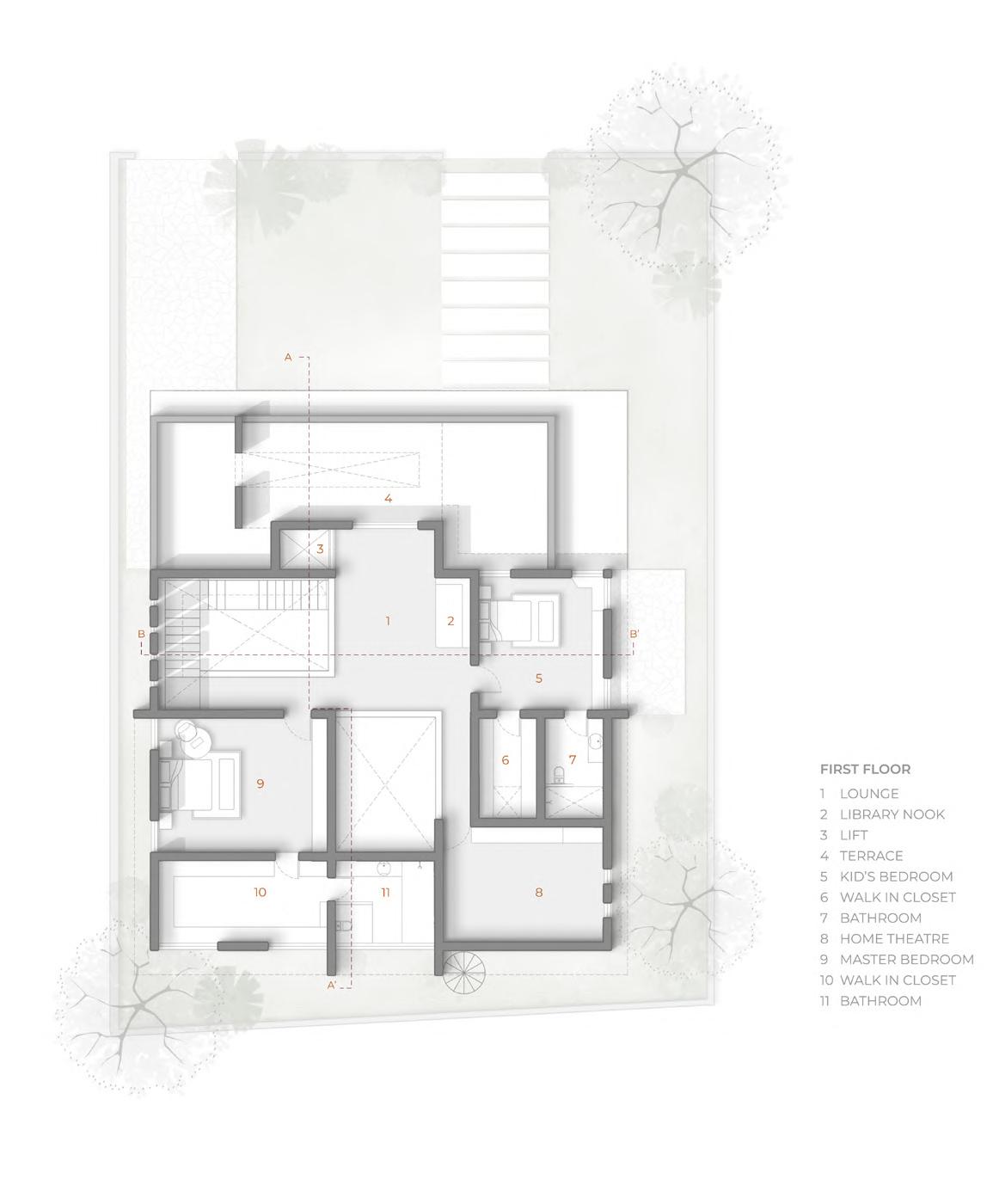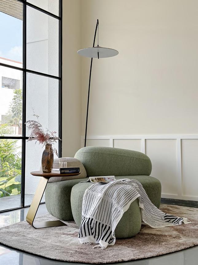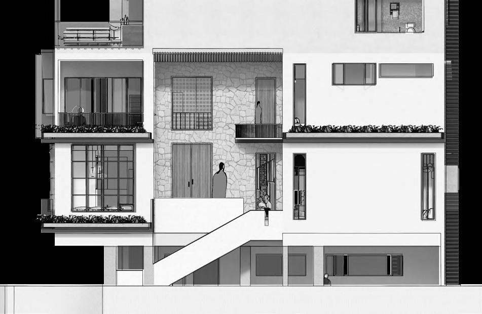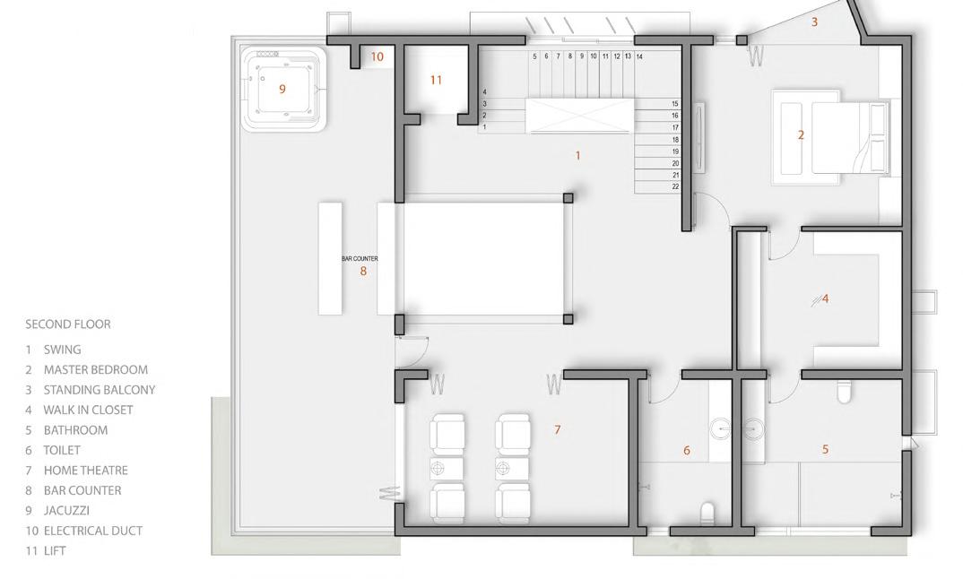 •Double-height entrance with juxtaposing staircase, curved balcony, and terrace window seating, fostering volumetric connectivity and conversation.