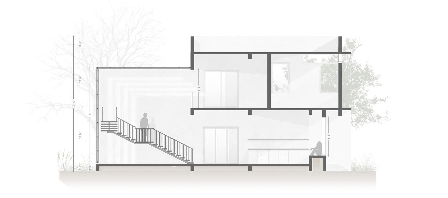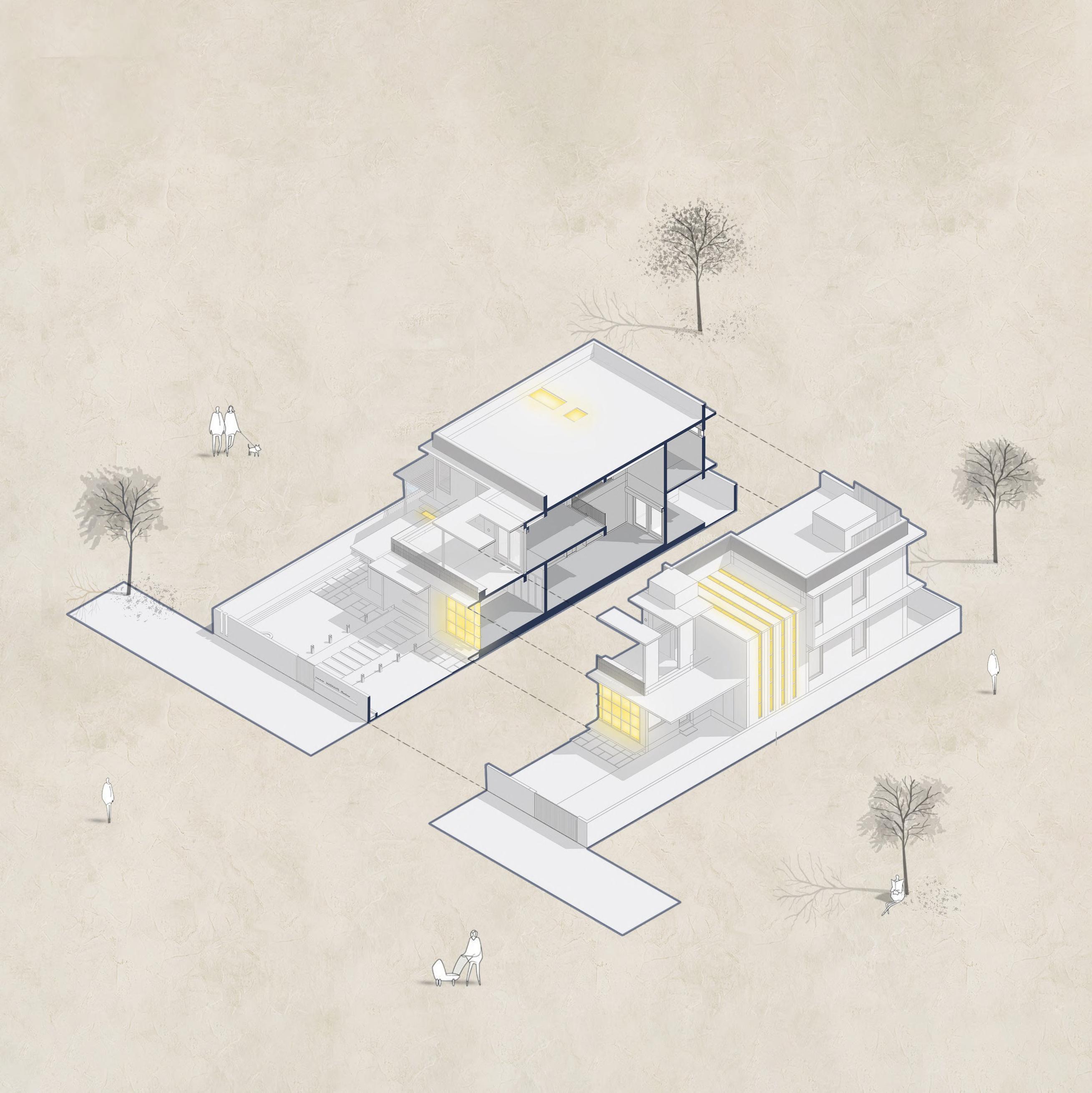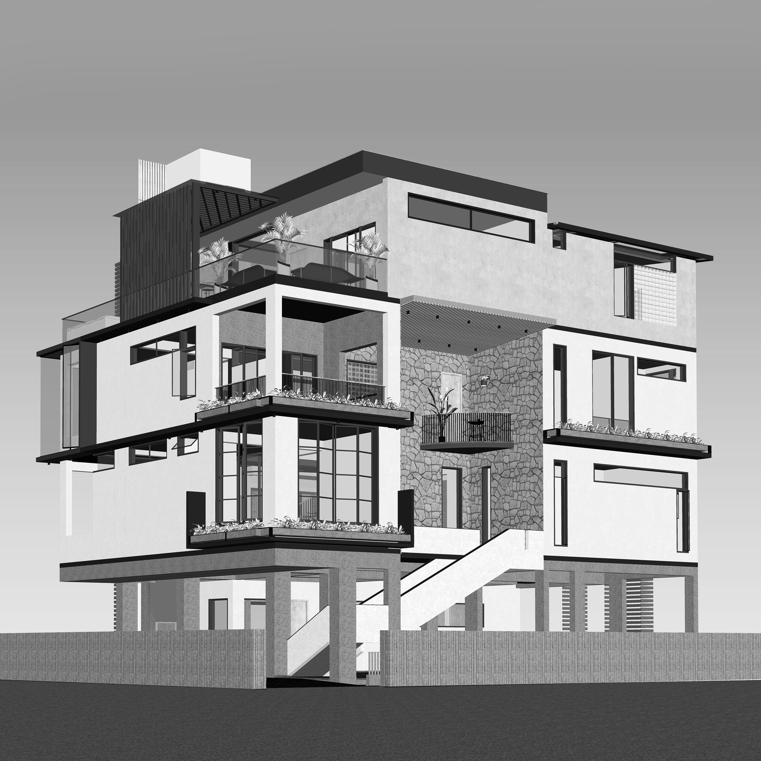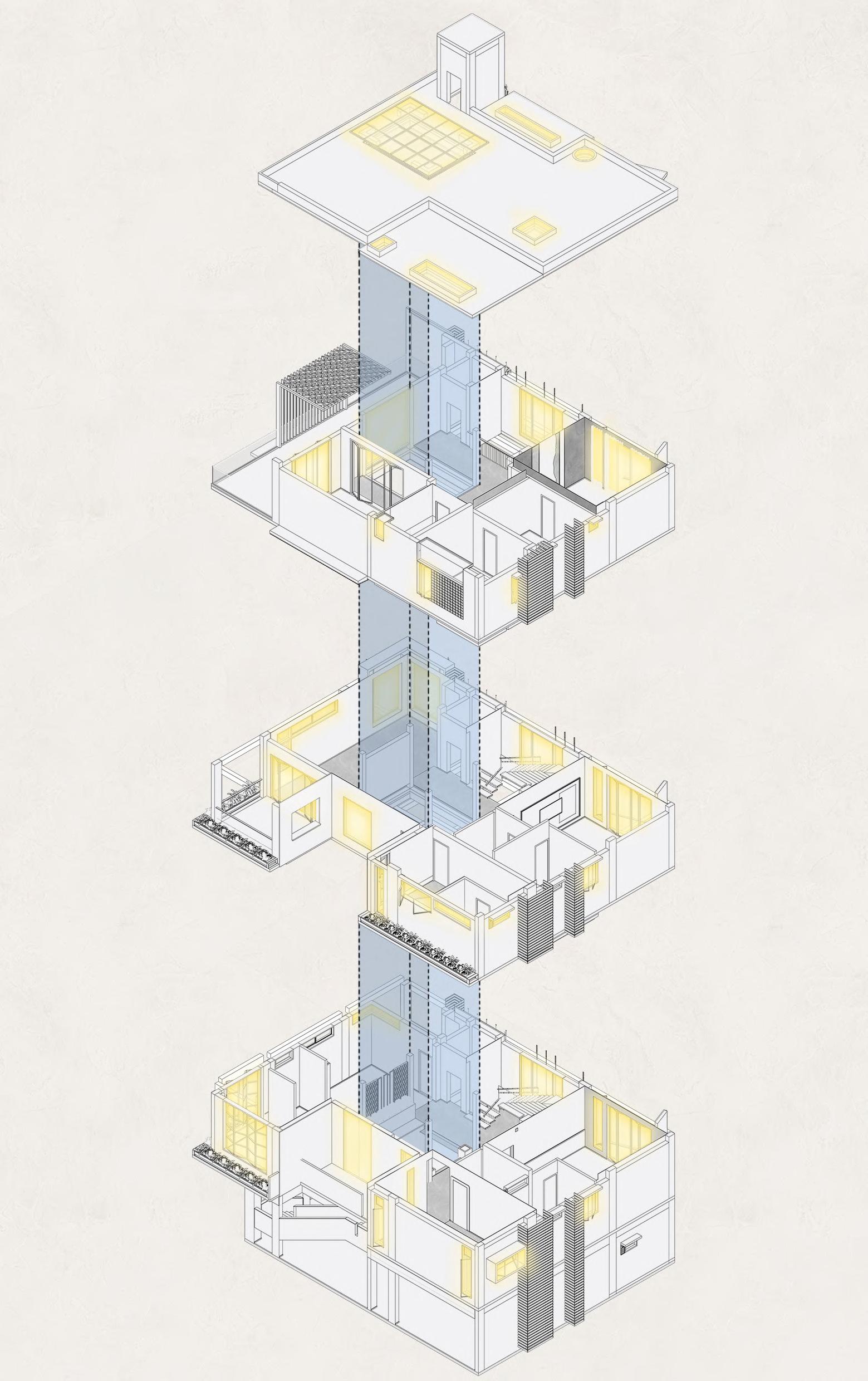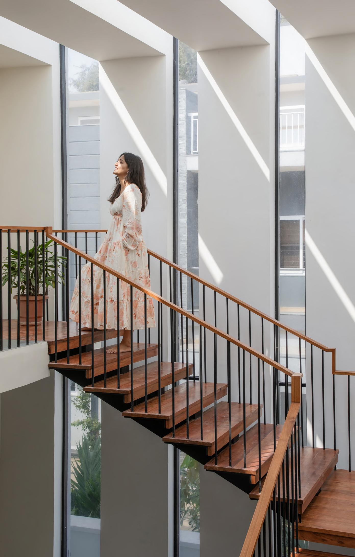 •Triple-height stairwell cutout with large windows, chajja projections, and perforated facade partitions to mitigate harsh south light and create dramatic light patterns.