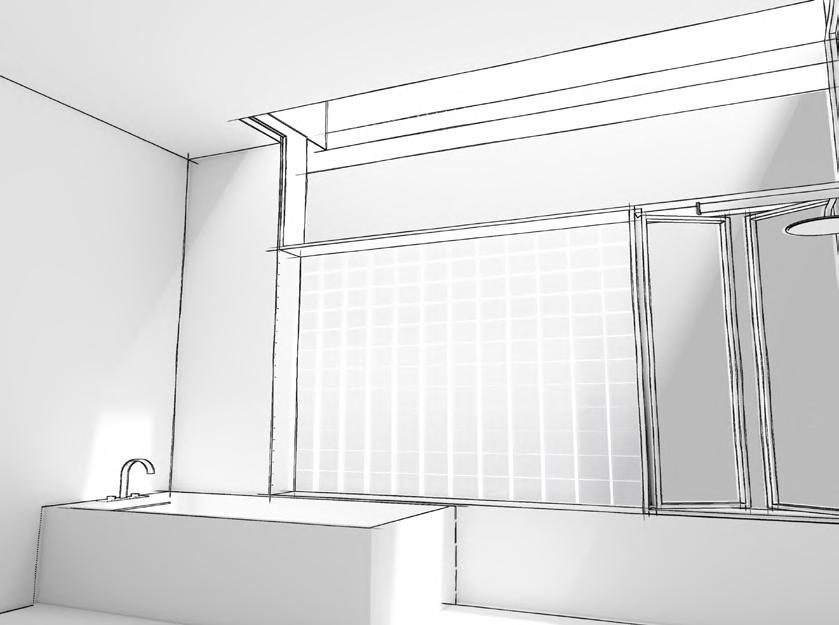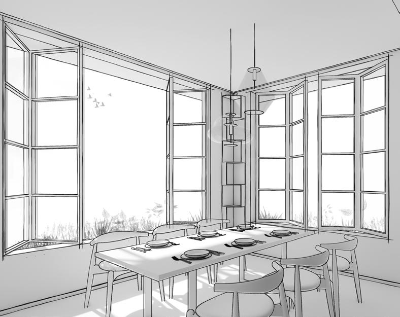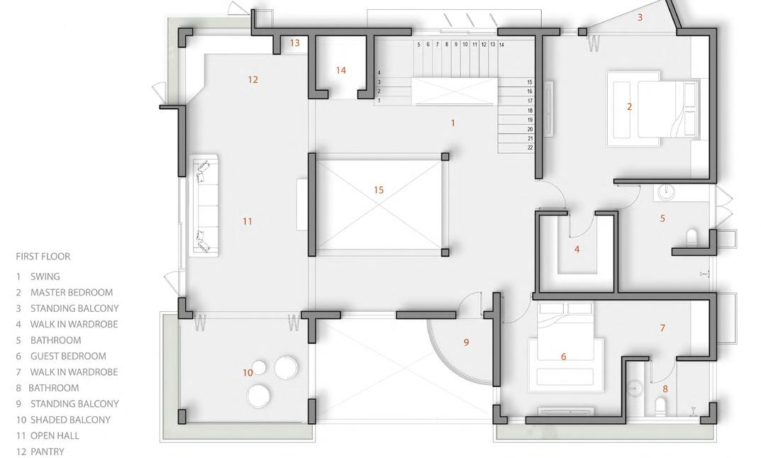 Note: Recessed southdeck, followed by double height grand dining room, featuring seamless integration of floating stairs and L band window into living space, grand formal living looking out through north verendah (left to right).Bathroom, double height, lift shaft,terrace with L band pergola (first floor).